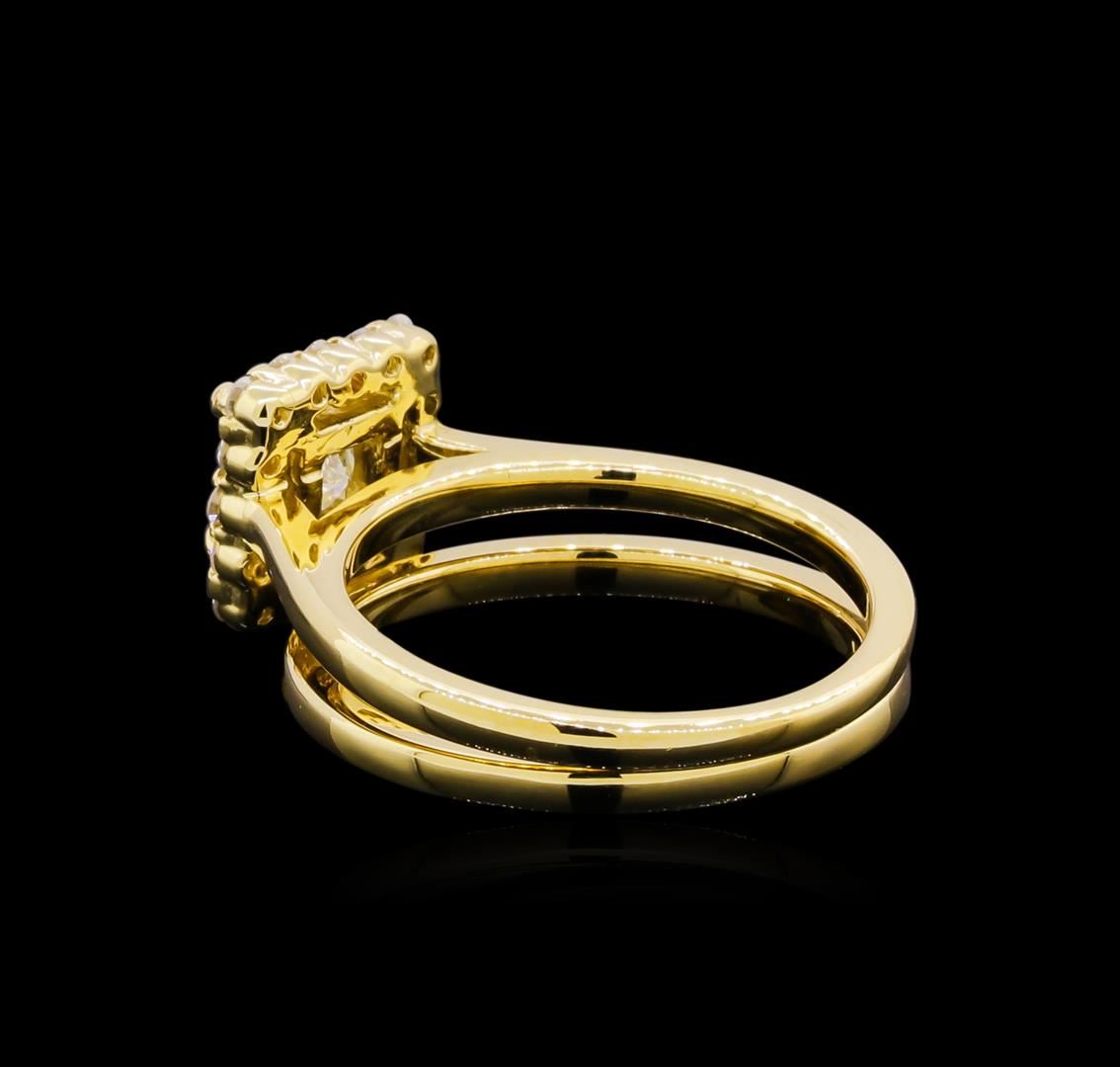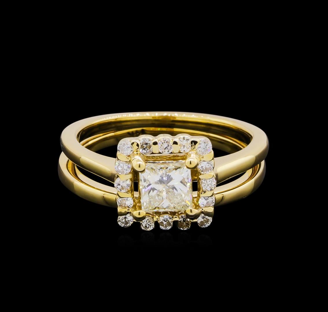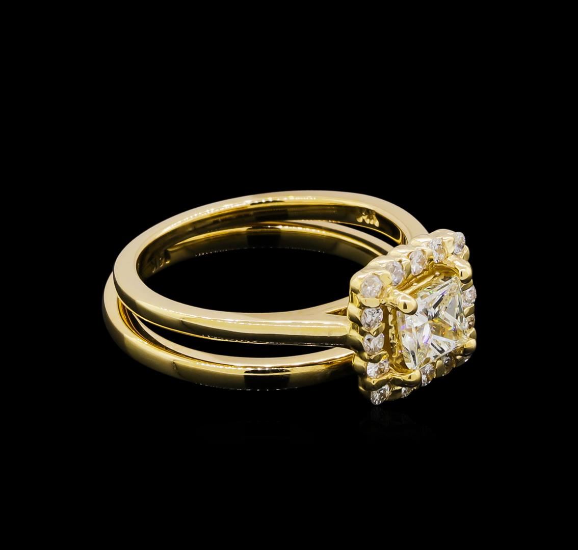 One electronically tested 14KT yellow gold ladies cast diamond wedding set. Identified with markings of "14K". Condition is new, good workmanship. Containing: One prong set princess cut diamond, measuring 4.90 x 4.60 x 3.45mm (depth est.) approximate weight of 0.66ct. Graded in the setting. Clarity SI-2 Color L Depth 75.0% Table 82.6% Sixteen channel set round brilliant cut diamonds, measuring 1.50 x 0.90mm (depth est.) approximate total weight of 16 Stones = 0.25ct. Graded in the setting. Clarity SI-2 to I-1 Color: G-I Total Weight of Diamonds: 0.91 ct. Total Weight of Wedding Set: 5.45 grams. AIG Appraised at $5,650.00.