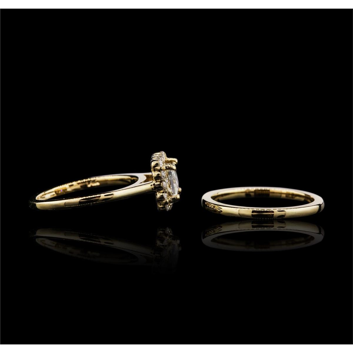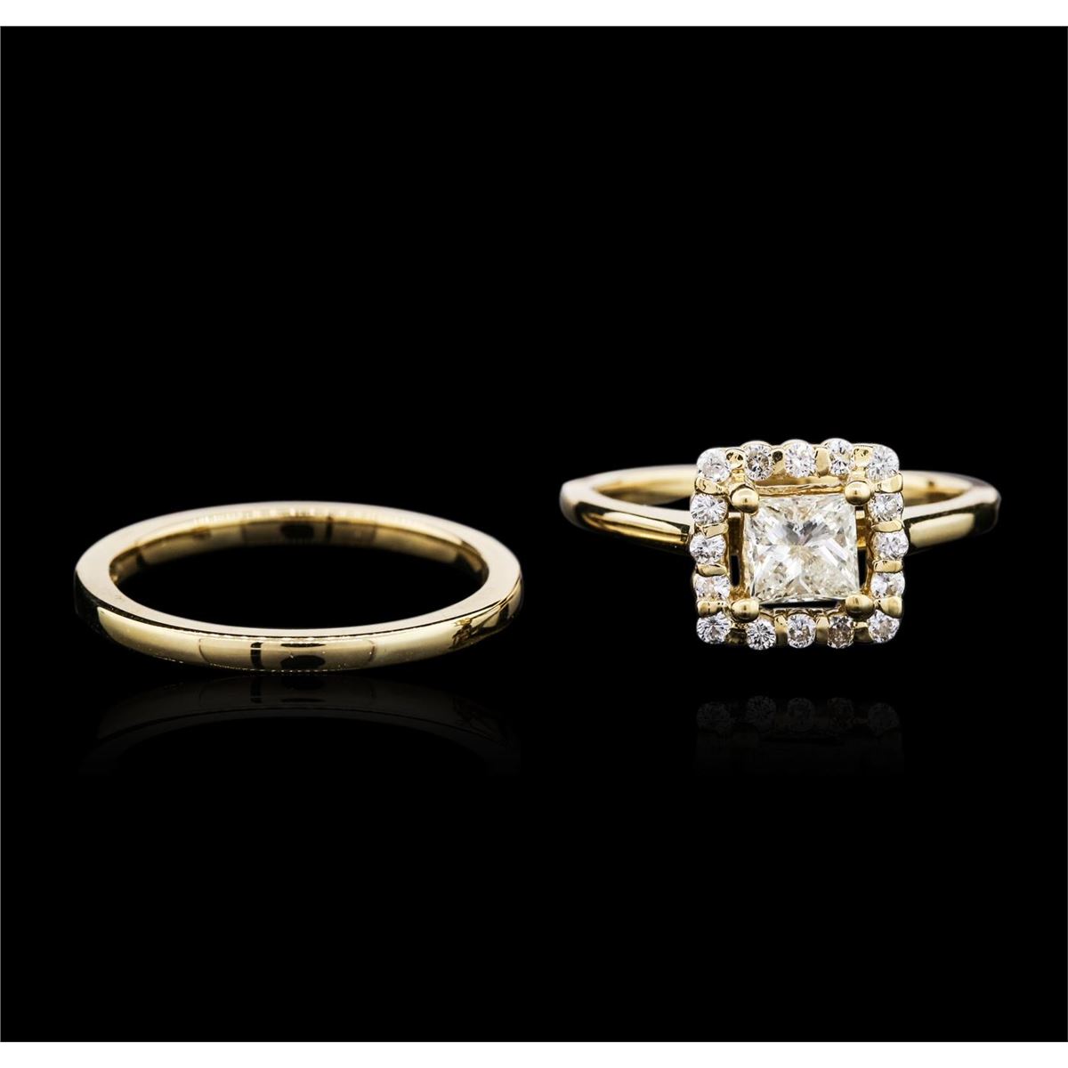One electronically tested 14KT yellow gold ladies cast diamond wedding set. Identified with markings of "14K". Condition is new, good workmanship. Containing: One prong set princess cut diamond, measuring 4.90 x 4.60 x 3.45mm (depth est.) approximate weight of 0.66ct. Graded in the setting. Clarity SI-2 Color L Depth 75.0% Table 82.6% Sixteen channel set round brilliant cut diamonds, measuring 1.50 x 0.90mm (depth est.) approximate total weight of 16 Stones = 0.25ct. Graded in the setting. Clarity SI-2 to I-1 Color: G-I Total Weight of Diamonds: 0.91 ct. Total Weight of Wedding Set: 5.45 grams. AIG Appraised at $5,650.00.