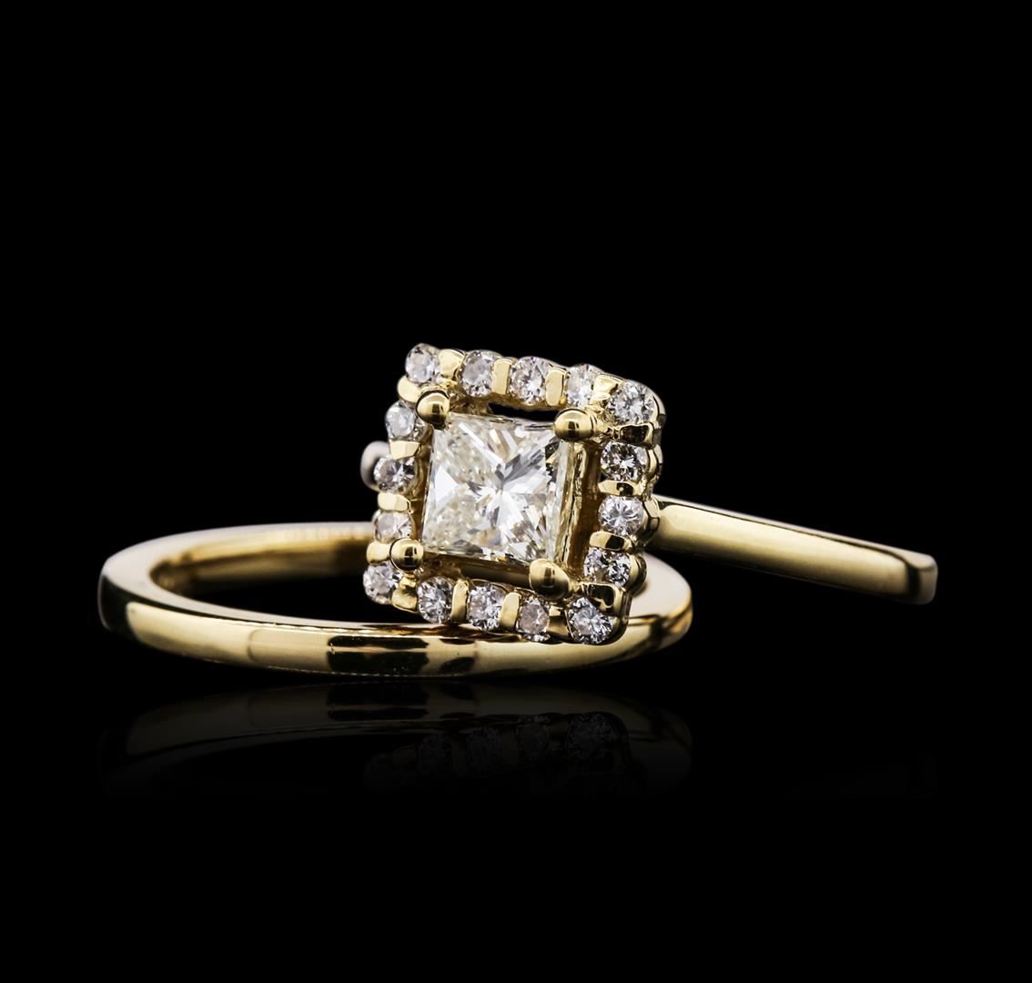 One electronically tested 14KT yellow gold ladies cast diamond wedding set. Identified with markings of "14K". Condition is new, good workmanship. Containing: One prong set princess cut diamond, measuring 4.90 x 4.60 x 3.45mm (depth est.) approximate weight of 0.66ct. Graded in the setting. Clarity SI-2 Color L Depth 75.0% Table 82.6% Sixteen channel set round brilliant cut diamonds, measuring 1.50 x 0.90mm (depth est.) approximate total weight of 16 Stones = 0.25ct. Graded in the setting. Clarity SI-2 to I-1 Color: G-I Total Weight of Diamonds: 0.91 ct. Total Weight of Wedding Set: 5.45 grams. AIG Appraised at $5,650.00.