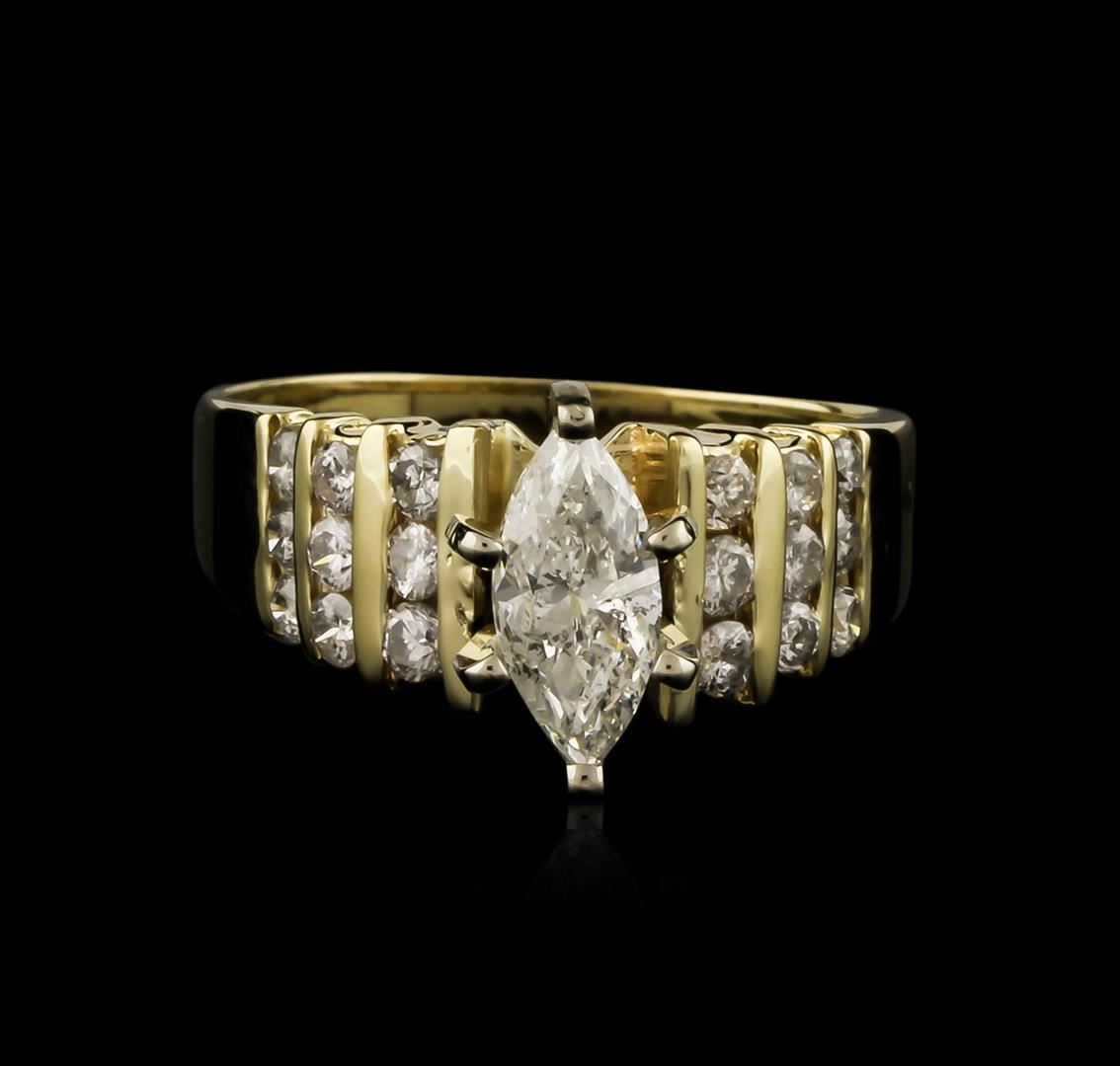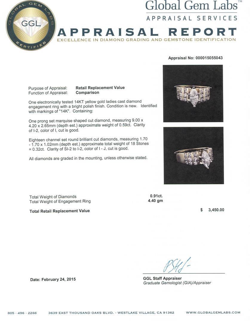 One electronically tested 14KT yellow gold ladies cast diamond engagement ring with a bright polish finish. Identified with markings of "14K". Condition is new. Containing: One prong set marquise shaped cut diamond, measuring 9.00 x 4.20 x 2.65mm (depth est.) approximate weight of 0.59ct. Clarity: I-2. Color: I, Cut is Good. Eighteen channel set round brilliant cut diamonds, measuring 1.70 - 1.70 x 1.02mm (depth est.) approximate total weight of 18 Stones = 0.32ct. Clarity: SI-2 to I-2. Color: I - J, Cut is Good. All diamonds are graded in the mounting, unless otherwise stated. Total Weight of Diamonds 0.91ct. Total Weight of Engagement Ring 4.40 grams. GGL Appraised at $3,450.00.