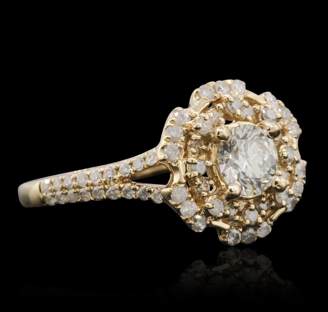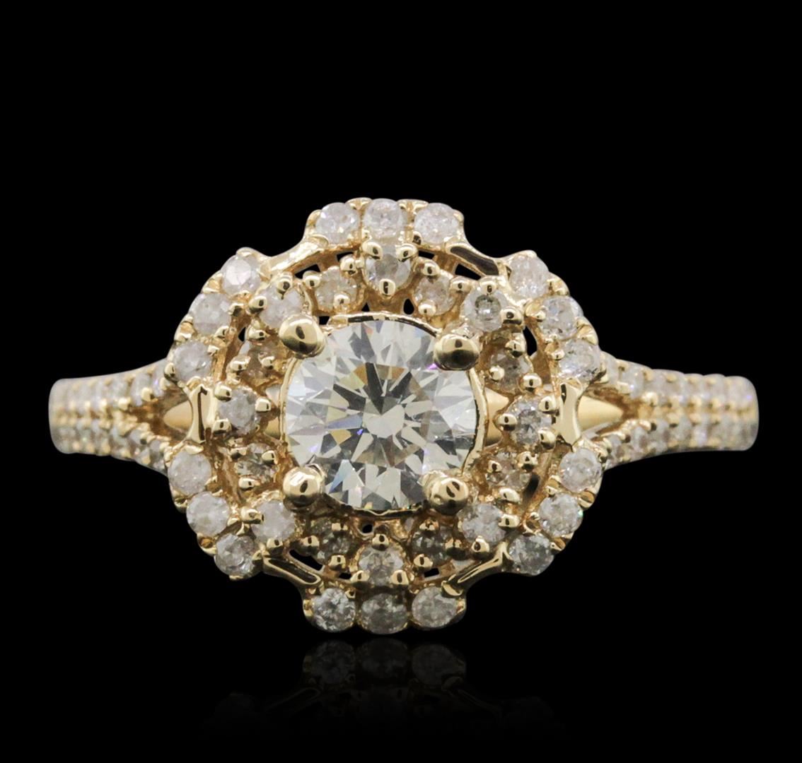 One electronically tested 14KT yellow gold ladies combination cast & assembled engagement ring with a split shank with a bright polish finish. Identified with markings of "14K". Condition is new. Containing: One prong set round brilliant cut diamond, measuring 5.40 - 5.40 x 3.24mm (depth est.) approximate weight of 0.58ct. Clarity: SI-1. Color: K, Cut is Very Good. Seventy prong set round brilliant cut diamonds, measuring 1.10 - 1.10 x 0.66mm (depth est.) approximate total weight of 70 Stones = 0.34ct. Clarity: I-1 to I-2. Color: J - K, Cut is Good. All diamonds are graded in the mounting, unless otherwise stated. Total Weight of Diamonds 0.91ct. Total Weight of Ring 4.40 grams. GGL Appraised at $6,285.00.