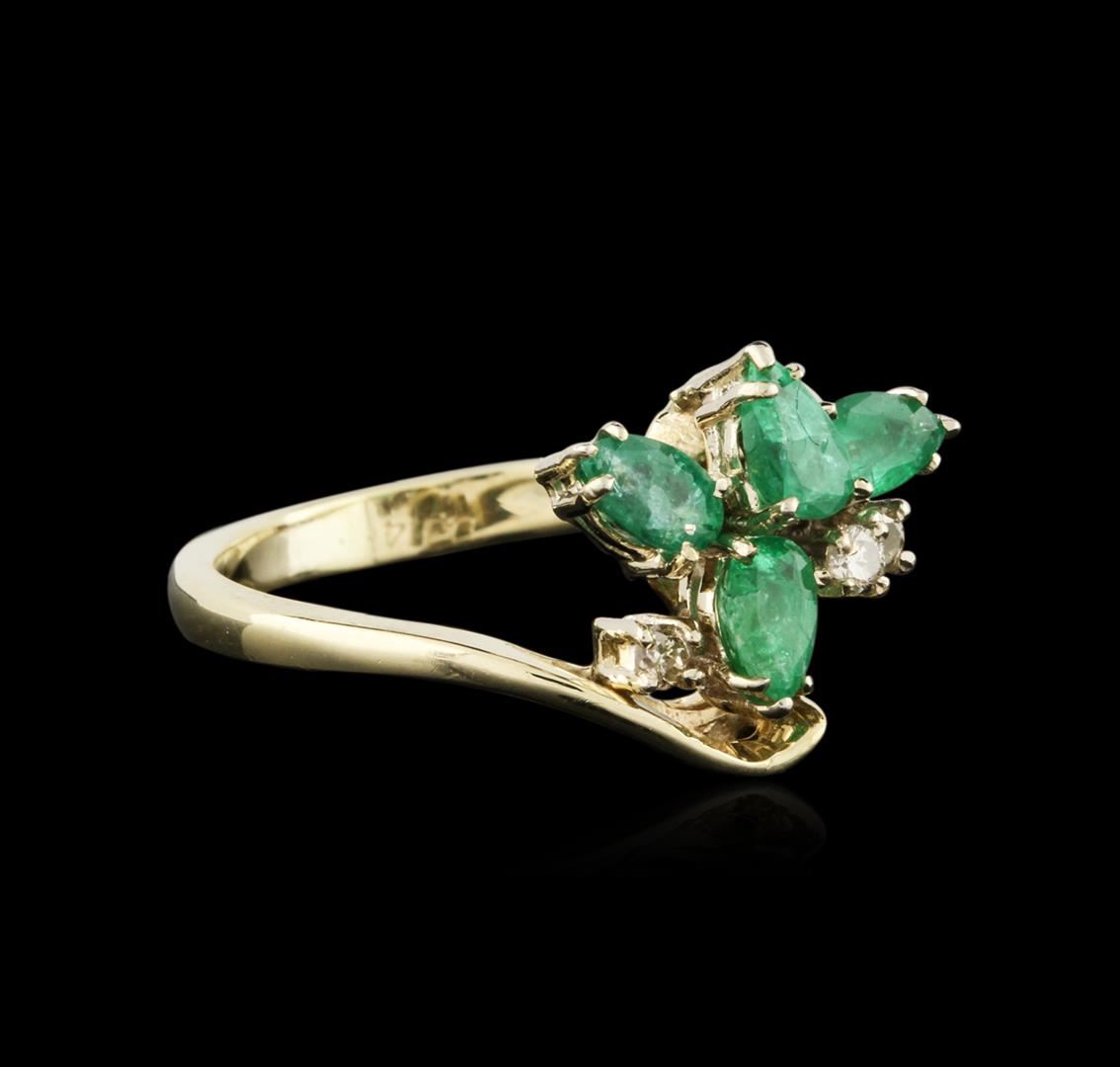 One ring featuring: 14KT yellow gold weighing 4.07 grams containing four pear shaped emeralds weighing a total of 0.92ct and three round cut diamonds weighing a total of 0.13 diamonds.