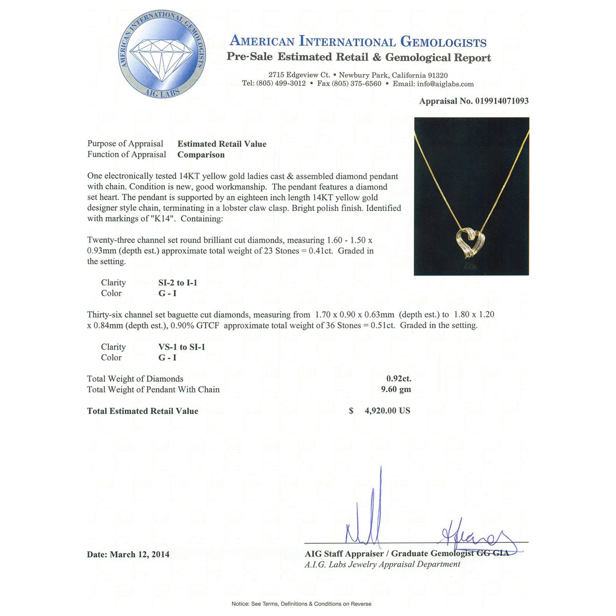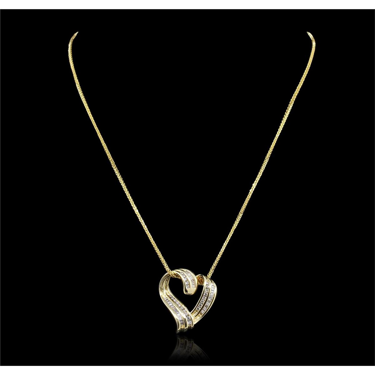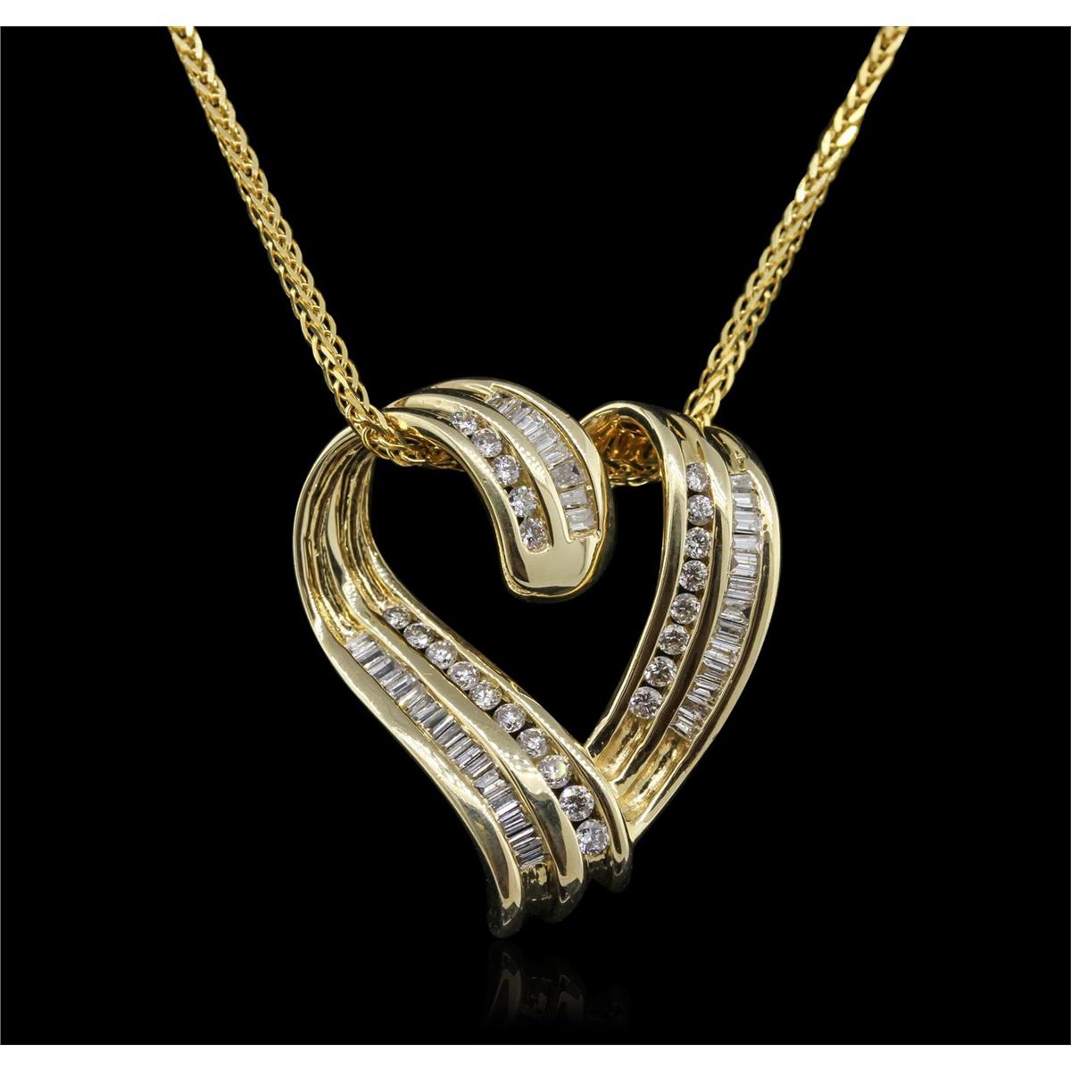 One electronically tested 14KT yellow gold ladies cast and assembled diamond pendant with chain. Condition is new, good workmanship. The pendant features a diamond set heart. The pendant is supported by an eighteen inch length 14KT yellow gold designer style chain, terminating in a lobster claw clasp. Bright polish finish. Identified with markings of "K14". Containing: Twenty-three channel set round brilliant cut diamonds, measuring 1.60 - 1.50 x 0.93mm (depth est) approximate total weight of 23 Stones = 0.41ct. Graded in the setting. Clarity SI-2 to I-1 Color G-I. Thirty-six channel set baguette cut diamonds, measuring from 1.70 x 0.90 x 0.63mm (depth est) to 1.80 x 1.20 x 0.84mm (depth est) 0.90% GTCF approximate total weight of 36 Stones = 0.51ct. Graded in the setting. Clarity VS-1 to SI-1 Color G-I. Total weight of diamonds 0.92ct. Total weight of pendant with chain 9.60 grams. AIG Appraised at $4,920.00.