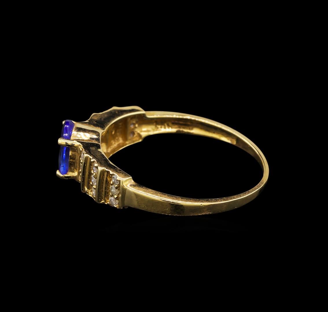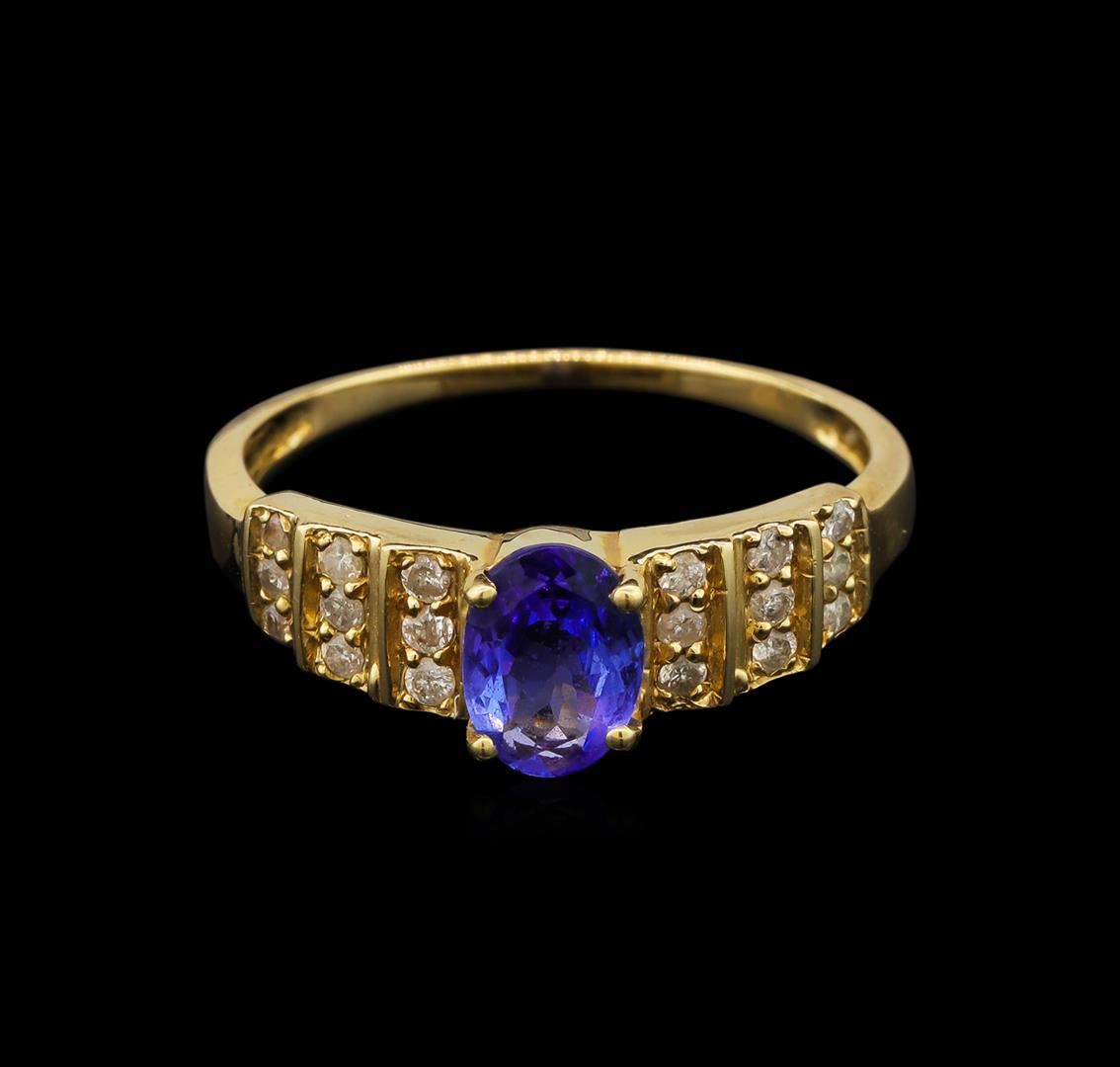 One electronically tested 14KT yellow gold ladies cast tanzanite and diamond ring with a bright polish finish. Identified with markings of "14K". Condition is new. Containing: One prong set oval modified brilliant cut natural tanzanite, measuring 7.30 x 5.30 x 3.45mm, approximate weight of 0.94ct., clarity is eye clean, type I, medium light, slightly grayish, violet color, (GIA V 4/2), cut is good. Eighteen prong set round brilliant cut diamonds, measuring 1.30 - 1.30 x 0.78mm (depth est.) approximate total weight of 18 Stones = 0.14ct. Clarity: I-1 to I-2. Color: I - J. Colored gemstones are presumed to have been subjected to commonly used enhancement processes. All diamonds and colored gemstones are graded in the mounting, unless otherwise stated. Total Weight of Colored Stones 0.94ct. Total Weight of Diamonds 0.14ct. Total Weight of Ring 3.10 grams. GGL Appraised.