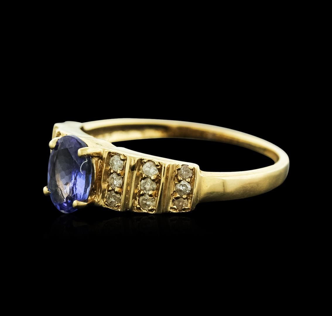 One electronically tested 14KT yellow gold ladies cast tanzanite and diamond ring with a bright polish finish. Identified with markings of "14K". Condition is new. Containing: One prong set oval modified brilliant cut natural tanzanite, measuring 7.30 x 5.30 x 3.45mm, approximate weight of 0.94ct., clarity is eye clean, type I, medium light, slightly grayish, violet color, (GIA V 4/2), cut is good. Eighteen prong set round brilliant cut diamonds, measuring 1.30 - 1.30 x 0.78mm (depth est.) approximate total weight of 18 Stones = 0.14ct. Clarity: I-1 to I-2. Color: I - J. Colored gemstones are presumed to have been subjected to commonly used enhancement processes. All diamonds and colored gemstones are graded in the mounting, unless otherwise stated. Total Weight of Colored Stones 0.94ct. Total Weight of Diamonds 0.14ct. Total Weight of Ring 3.10 grams. GGL Appraised at $1,665.00.