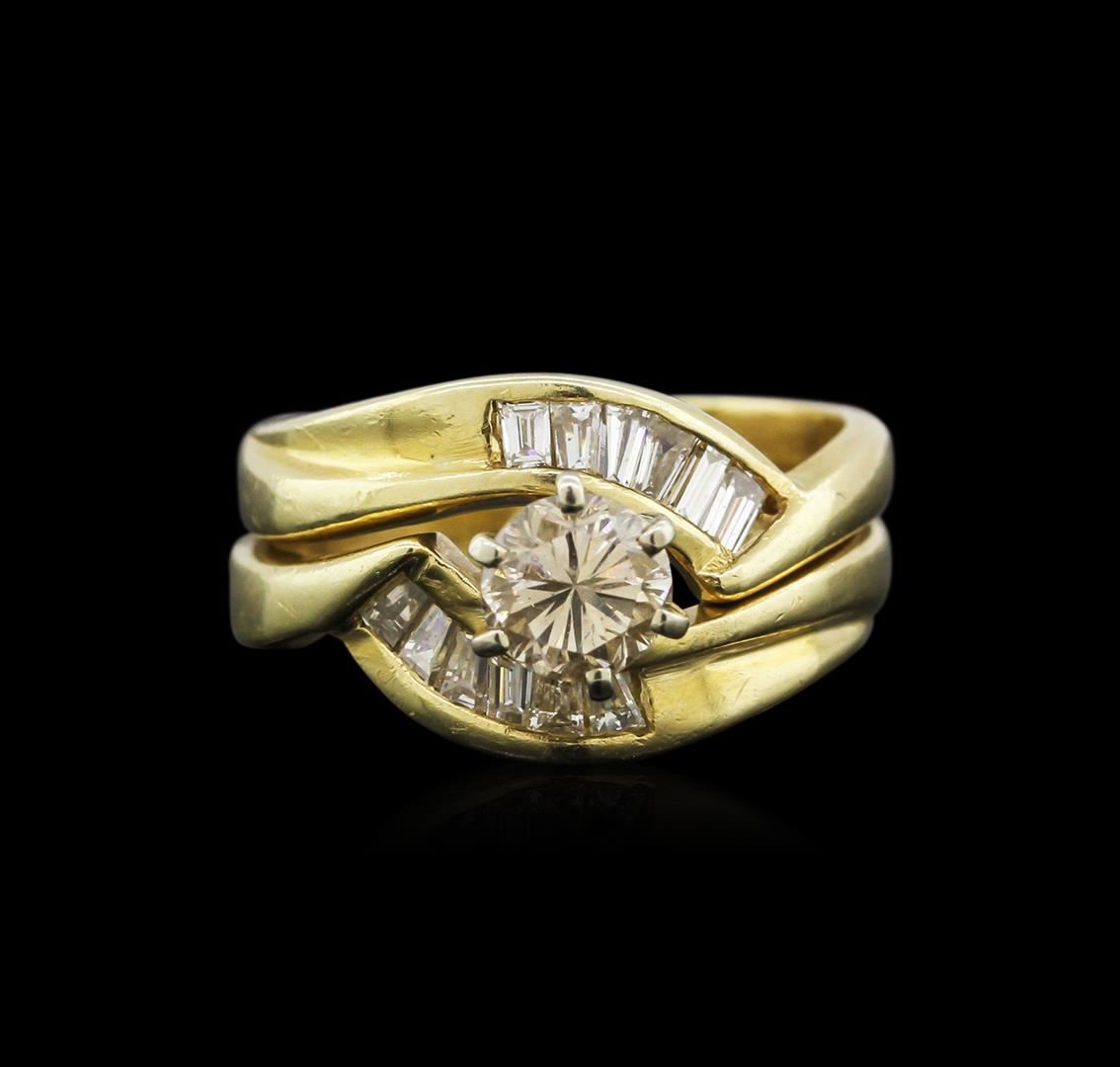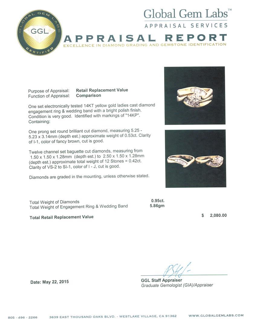 One set electronically tested 14KT yellow gold ladies cast diamond engagement ring & wedding band with a bright polish finish. Identified with markings of "14KP". Condition is very good. Containing: One prong set round brilliant cut diamond, measuring 5.25 - 5.23 x 3.14mm (depth est.) approximate weight of 0.53ct. Clarity: I-1, Cut is Good. Twelve channel set baguette cut diamonds, measuring from 1.50 x 1.50 x 1.28mm (depth est.) to 2.50 x 1.50 x 1.28mm (depth est.) approximate total weight of 12 Stones = 0.42ct. Clarity: VS-2 to SI-1. Color: I - J, Cut is Good. Diamonds are graded in the mounting, unless otherwise stated. Total Weight of Diamonds 0.95ct. Total Weight of Engagement Ring & Wedding Band 5.86 grams. GGL Appraised at $2,080.00.