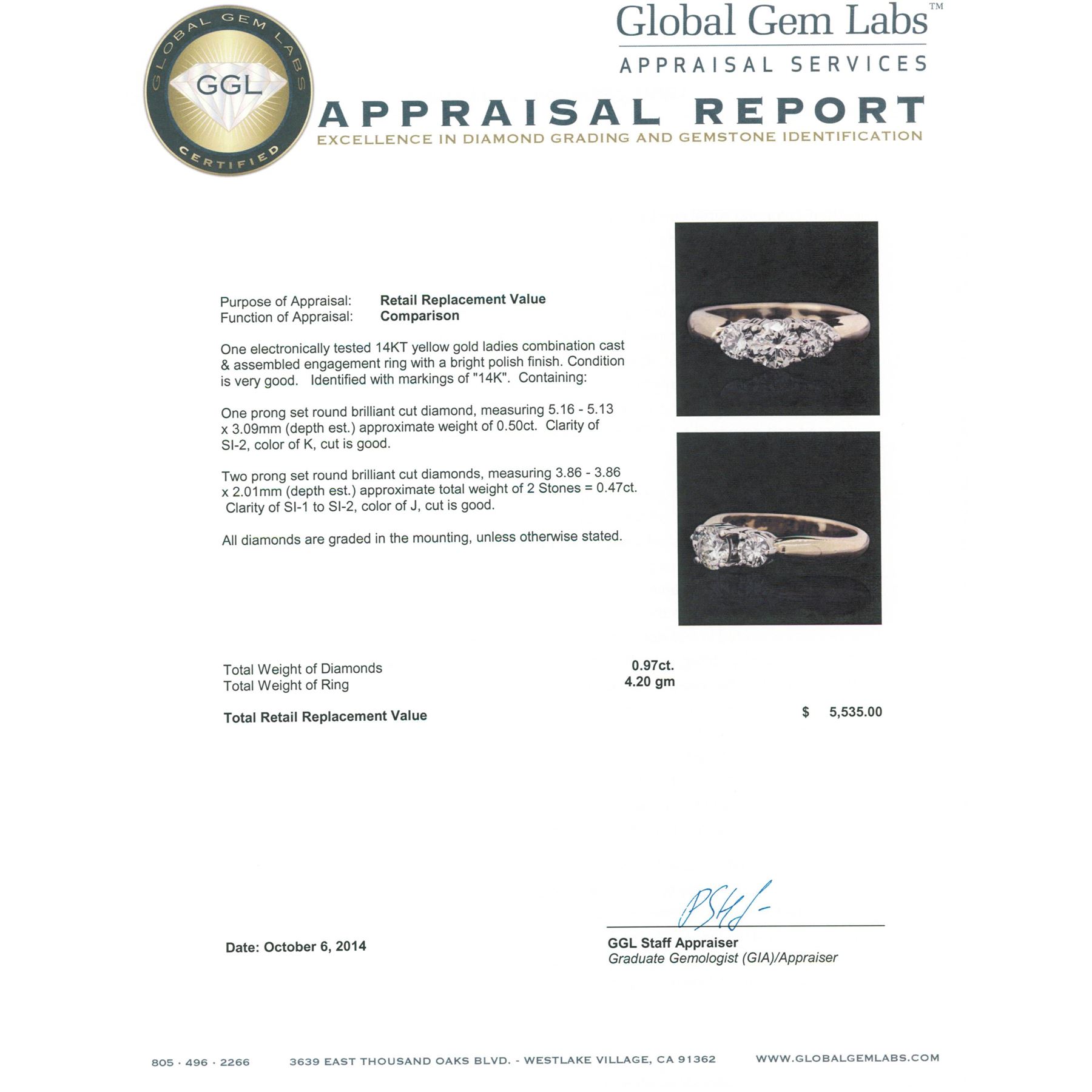 One electronically tested 14KT yellow gold ladies combination cast & assembled engagement ring with a bright polish finish. Identified with markings of "14K". Condition is very good. Containing: One prong set round brilliant cut diamond, measuring 5.16 - 5.13 x 3.09mm (depth est.) approximate weight of 0.50ct. Clarity: SI-2. Color: K, Cut is Good. Two prong set round brilliant cut diamonds, measuring 3.86 - 3.86 x 2.01mm (depth est.) approximate total weight of 2 Stones = 0.47ct. Clarity: SI-1 to SI-2. Color: J, Cut is Good. All diamonds are graded in the mounting, unless otherwise stated. Total Weight of Diamonds 0.97ct. Total Weight of Ring 4.20 grams. GGL Appraised at $5,535.00.