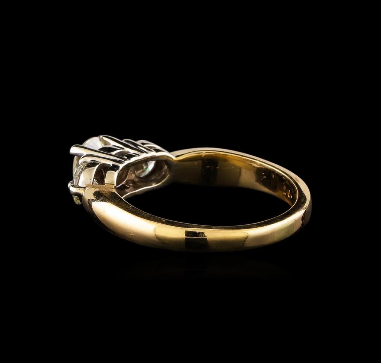 One electronically tested 14KT yellow gold ladies combination cast & assembled engagement ring with a bright polish finish. Identified with markings of "14K". Condition is very good. Containing: One prong set round brilliant cut diamond, measuring 5.16 - 5.13 x 3.09mm (depth est.) approximate weight of 0.50ct. Clarity: SI-2. Color: K, Cut is Good. Two prong set round brilliant cut diamonds, measuring 3.86 - 3.86 x 2.01mm (depth est.) approximate total weight of 2 Stones = 0.47ct. Clarity: SI-1 to SI-2. Color: J, Cut is Good. All diamonds are graded in the mounting, unless otherwise stated. Total Weight of Diamonds 0.97ct. Total Weight of Ring 4.20 grams. GGL Appraised.