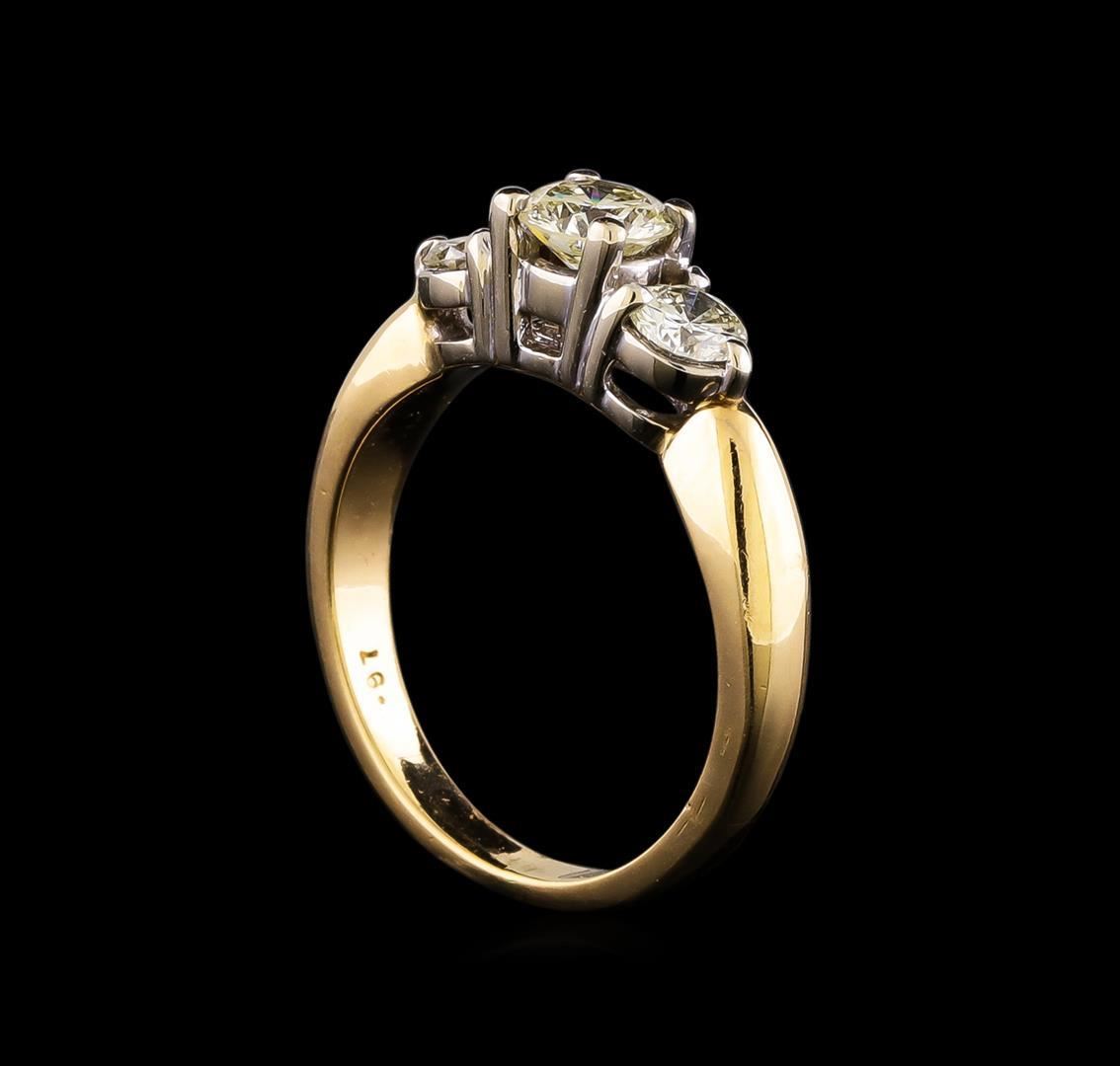 One electronically tested 14KT yellow gold ladies combination cast & assembled engagement ring with a bright polish finish. Identified with markings of "14K". Condition is very good. Containing: One prong set round brilliant cut diamond, measuring 5.16 - 5.13 x 3.09mm (depth est.) approximate weight of 0.50 ct. Clarity: SI-2. Color: K, Cut is Good. Two prong set round brilliant cut diamonds, measuring 3.86 - 3.86 x 2.01mm (depth est.) approximate total weight of 2 Stones = 0.47ct. Clarity: SI-1 to SI-2. Color: J, Cut is Good. All diamonds are graded in the mounting, unless otherwise stated. Total Weight of Diamonds 0.97ct. Total Weight of Ring 4.20 grams. GGL Appraised.