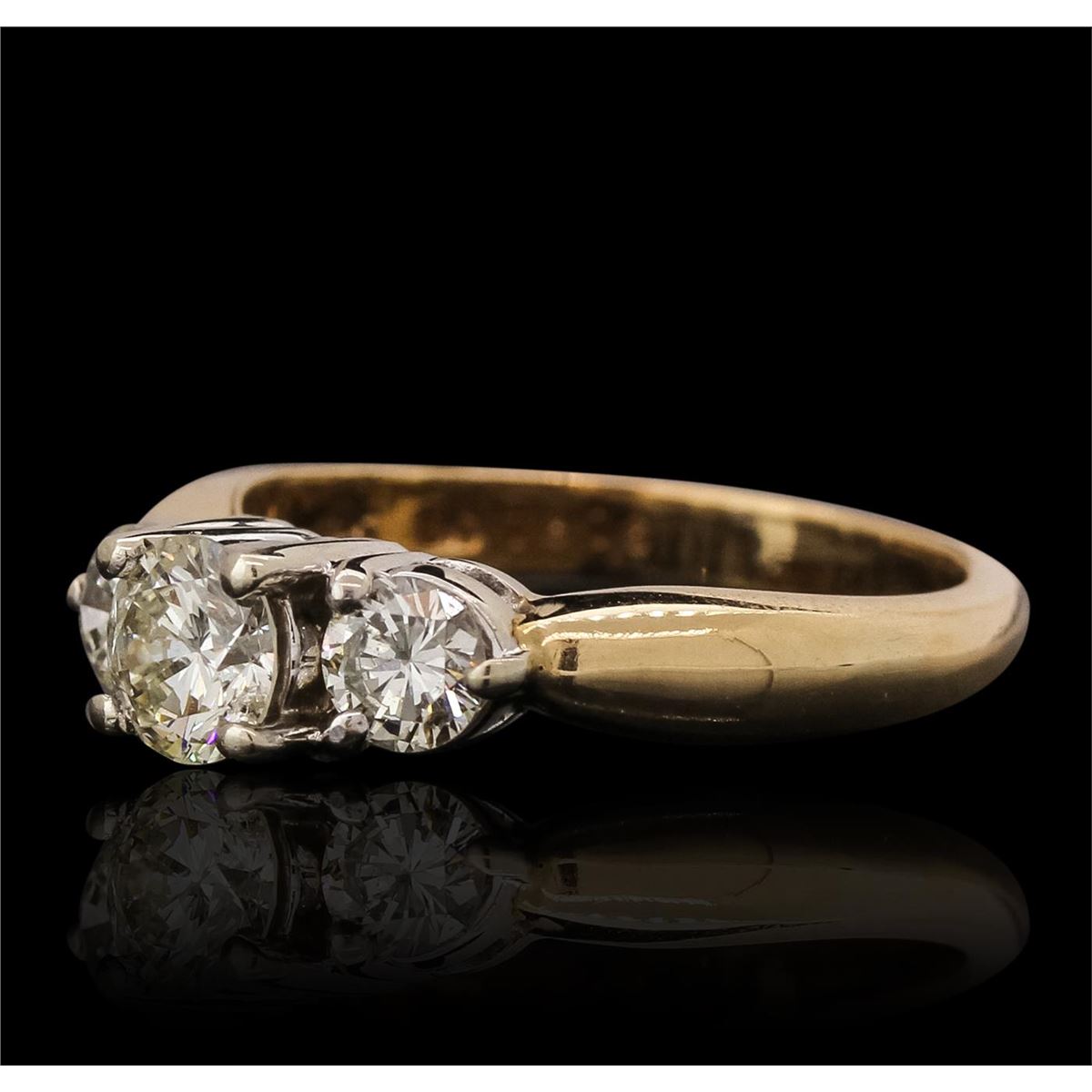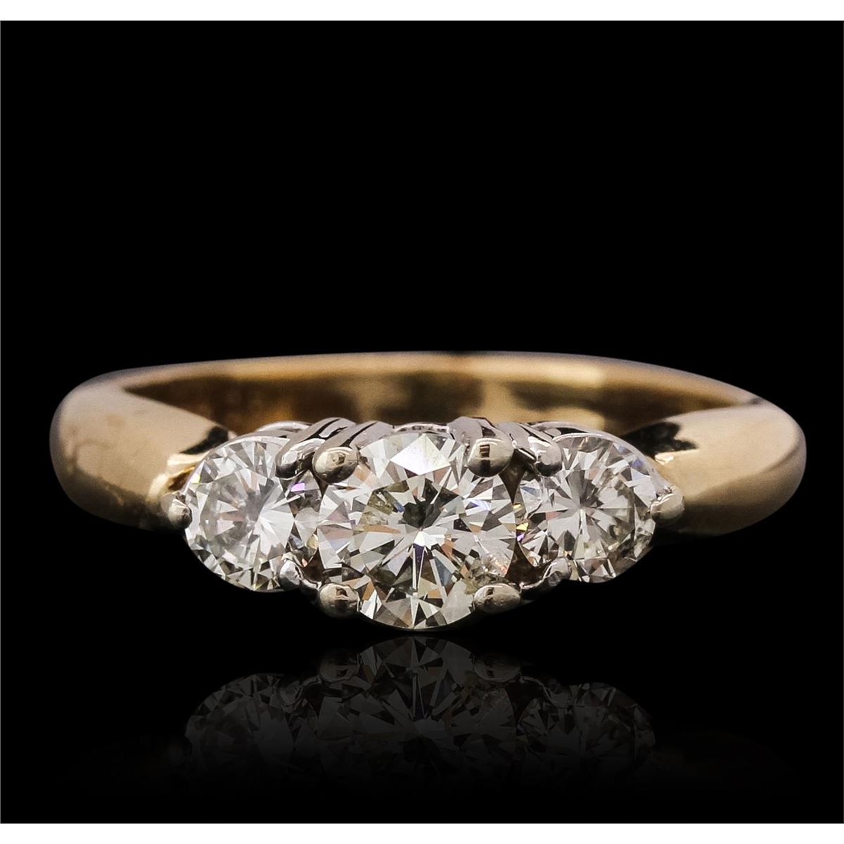 One electronically tested 14KT yellow gold ladies combination cast & assembled engagement ring with a bright polish finish. Identified with markings of "14K". Condition is very good. Containing: One prong set round brilliant cut diamond, measuring 5.16 - 5.13 x 3.09mm (depth est.) approximate weight of 0.50ct. Clarity: SI-2. Color: K, Cut is Good. Two prong set round brilliant cut diamonds, measuring 3.86 - 3.86 x 2.01mm (depth est.) approximate total weight of 2 Stones = 0.47ct. Clarity: SI-1 to SI-2. Color: J, Cut is Good. All diamonds are graded in the mounting, unless otherwise stated. Total Weight of Diamonds 0.97ct. Total Weight of Ring 4.20 grams. GGL Appraised at $5,535.00.