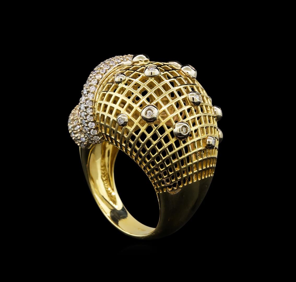 One electronically tested 14KT yellow gold ladies cast diamond ring with a bright polish finish. Identified with markings of "14K". Condition is new. Containing: One Hundred Sixty prong set round brilliant cut diamonds, measuring 1.00 - 1.00 x 0.60mm (depth est.) approximate total weight of 160 Stones = 0.98ct. Clarity: SI-2 to I-1. Color: I - J. All diamonds are graded in the mounting, unless otherwise stated. Total Weight of Diamonds 0.98ct. Total Weight of Ring 14.10 grams. GGL Appraised at $4,680.00.
