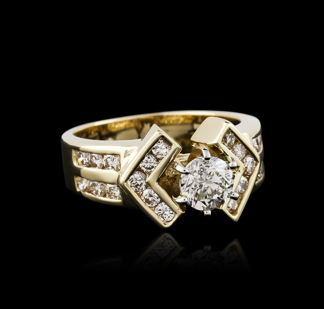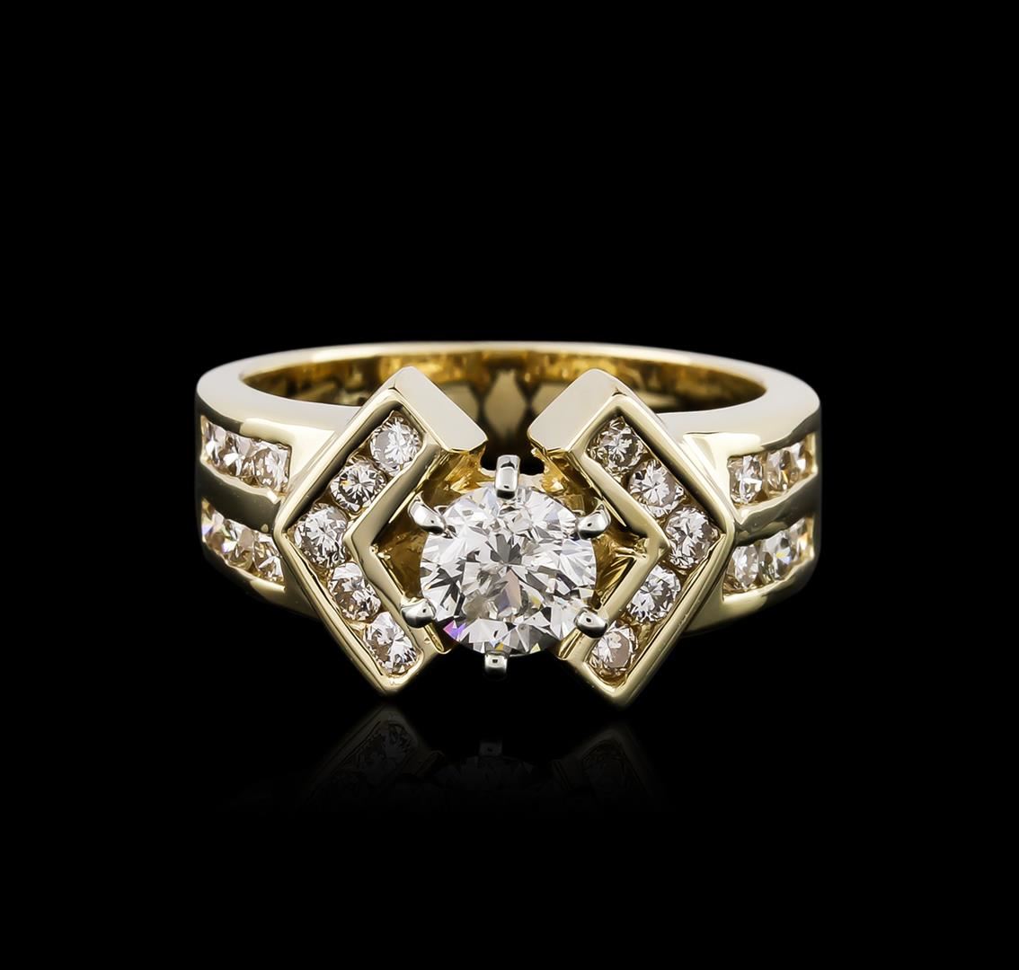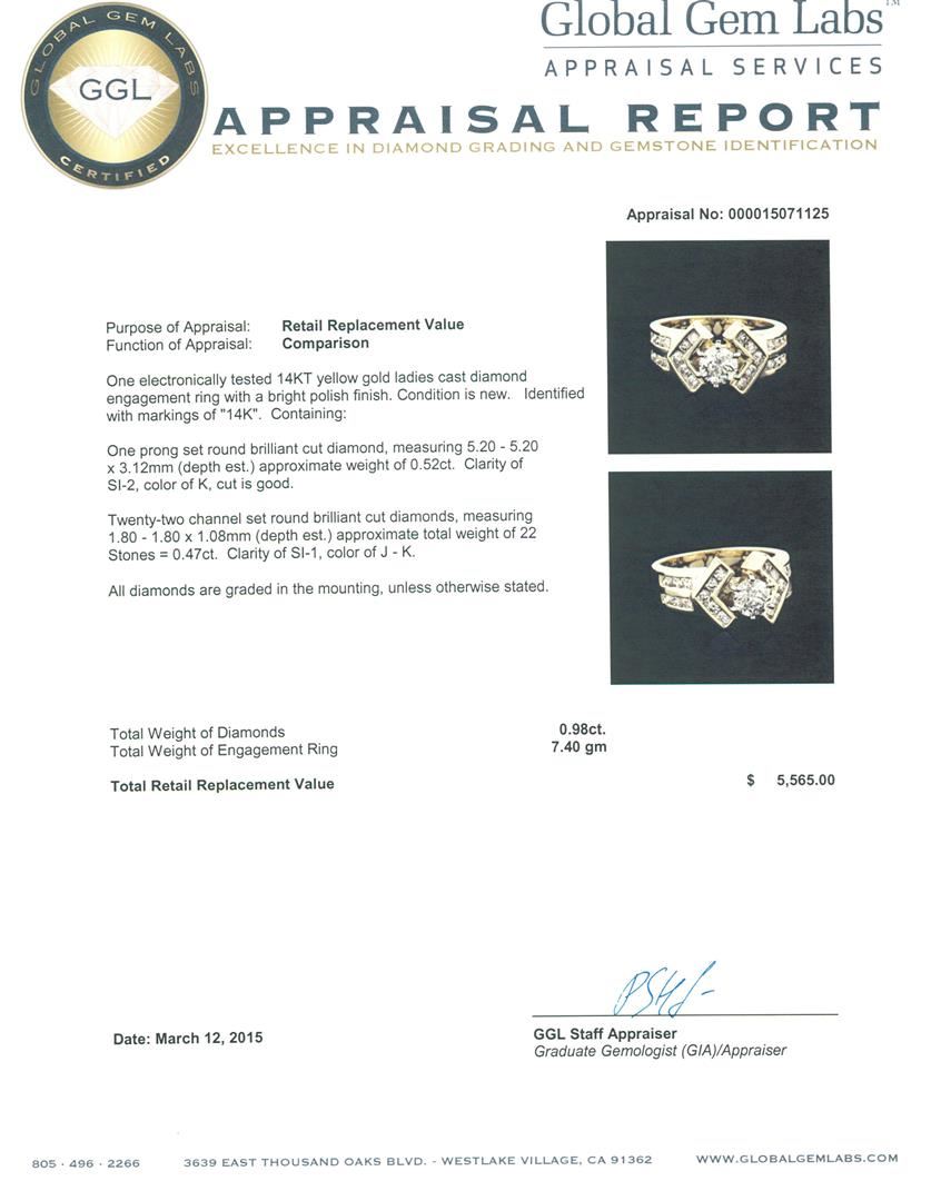 One electronically tested 14KT yellow gold ladies cast diamond engagement ring with a bright polish finish. Identified with markings of "14K". Condition is new. Containing: One prong set round brilliant cut diamond, measuring 5.20 - 5.20 x 3.12mm (depth est.) approximate weight of 0.52ct. Clarity: SI-2. Color: K, Cut is Good. Twenty-Two channel set round brilliant cut diamonds, measuring 1.80 - 1.80 x 1.08mm (depth est.) approximate total weight of 22 Stones = 0.47ct. Clarity: SI-1. Color: J - K. All diamonds are graded in the mounting, unless otherwise stated. Total Weight of Diamonds 0.98ct. Total Weight of Engagement Ring 7.40 grams. GGL Appraised at $5,565.00.