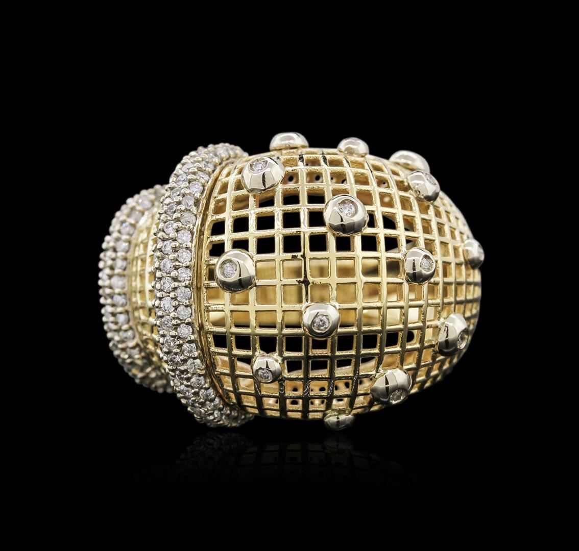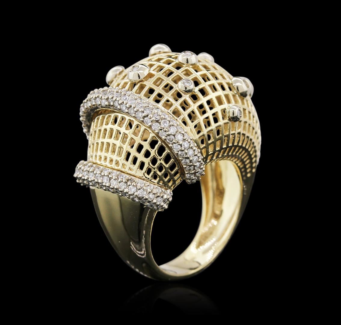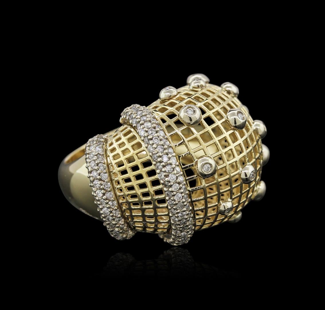 One electronically tested 14KT yellow gold ladies cast diamond ring with a bright polish finish. Identified with markings of "14K". Condition is new. Containing: One Hundred Sixty prong set round brilliant cut diamonds, measuring 1.00 - 1.00 x 0.60mm (depth est.) approximate total weight of 160 Stones = 0.98ct. Clarity: SI-2 to I-1. Color: I - J. All diamonds are graded in the mounting, unless otherwise stated. Total Weight of Diamonds 0.98ct. Total Weight of Ring 14.10 grams. GGL Appraised at $4,680.00.