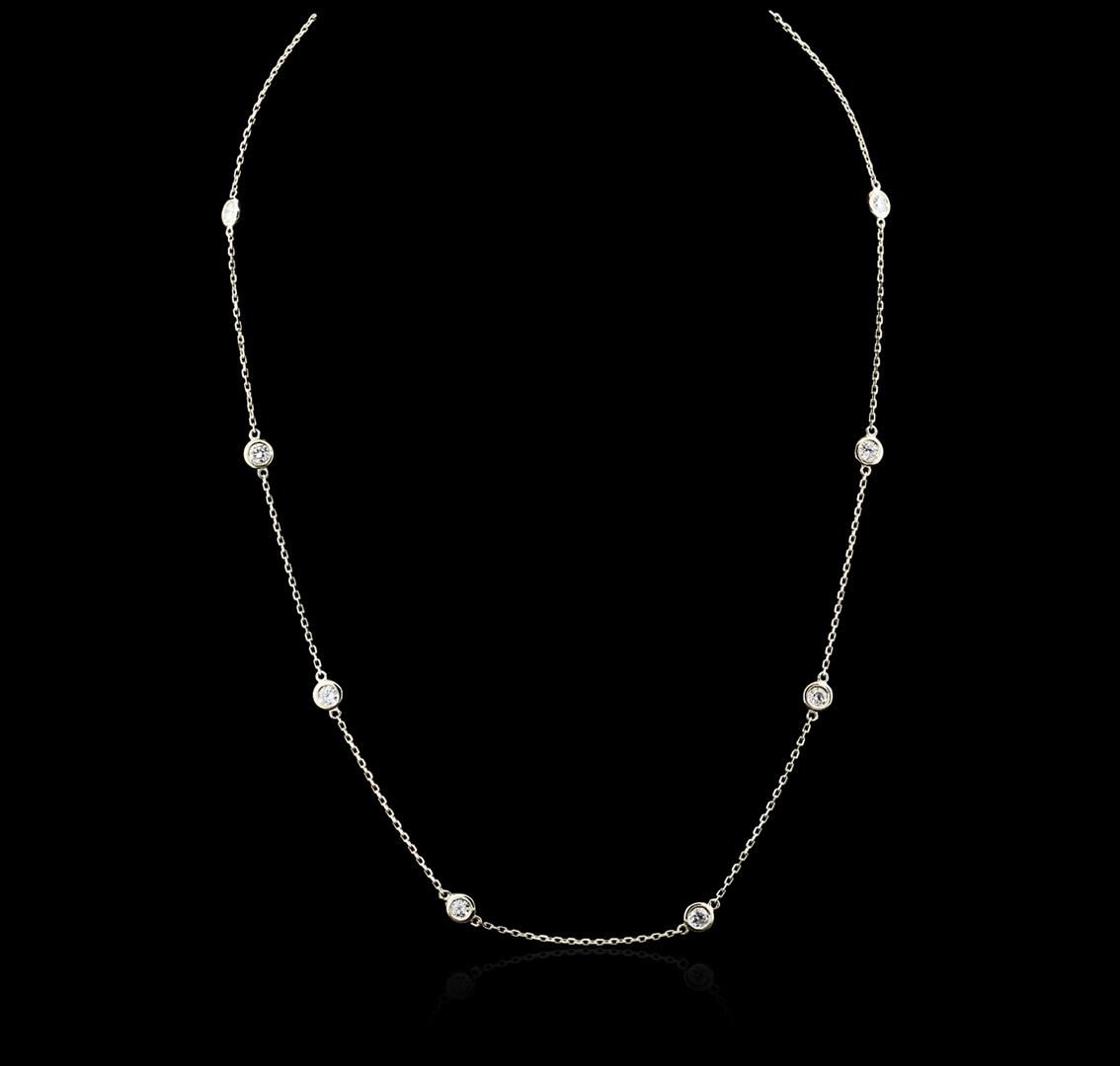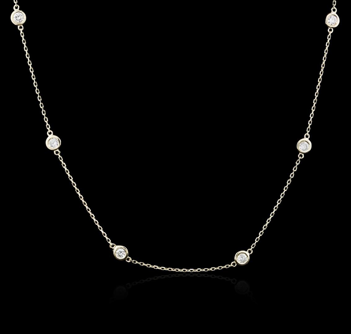 One electronically tested 14KT yellow gold ladies cast diamond necklace with a lobster claw clasp with a bright polish finish. Measurements: 18" in length Identified with markings of "K14". Condition is new. Containing: Ten bezel set round brilliant cut diamonds, measuring 3.00 - 3.00 x 1.80mm (depth est.) approximate total weight of 10 Stones = 0.99ct. Clarity: SI-1 to I-1. Color: K, Cut is Good. All diamonds are graded in the mounting, unless otherwise stated. Total Weight of Diamonds 0.99ct. Total Weight of Necklace 4.20 grams. GGL Appraised at $3,035.00.