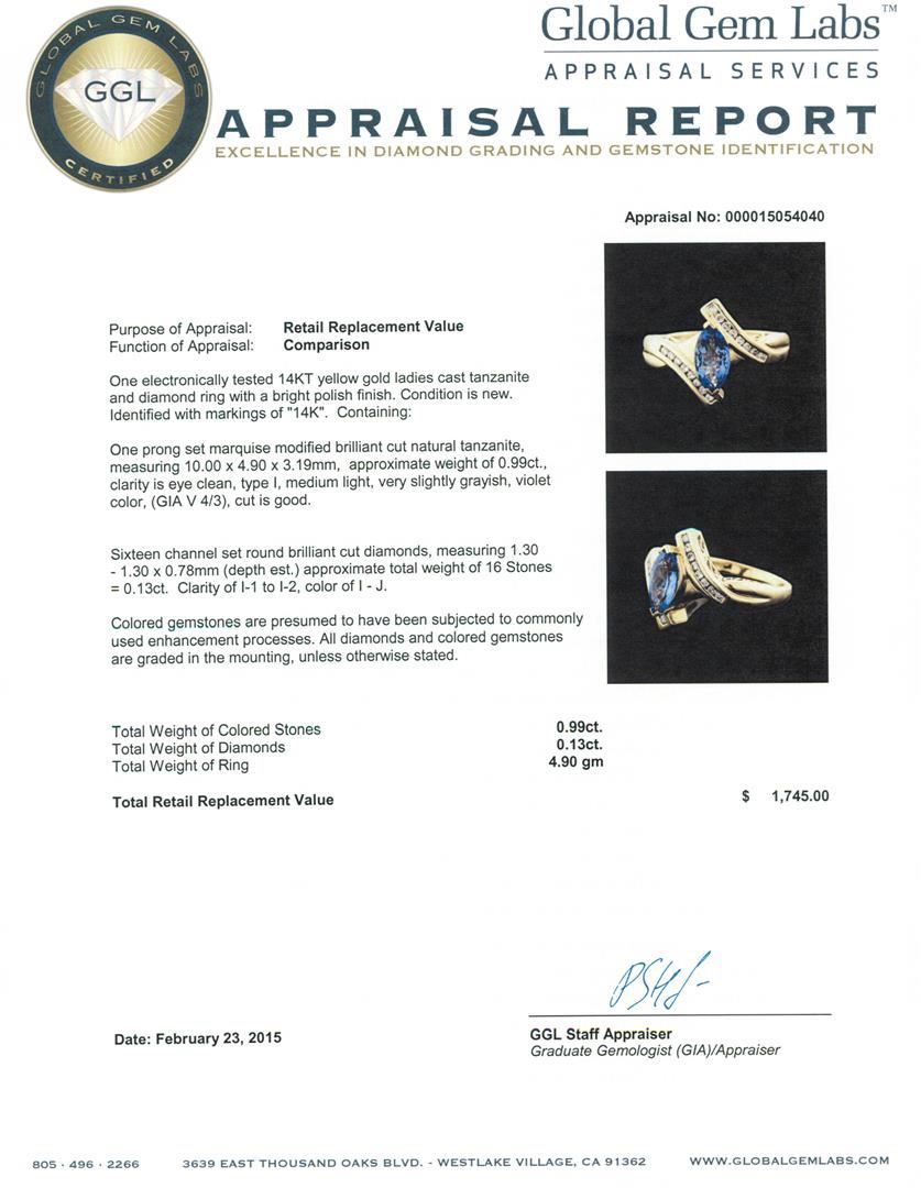 One electronically tested 14KT yellow gold ladies cast tanzanite and diamond ring with a bright polish finish. Identified with markings of "14K". Condition is new. Containing: One prong set marquise modified brilliant cut natural tanzanite, measuring 10.00 x 4.90 x 3.19mm, approximate weight of 0.99ct., clarity is eye clean, type I, medium light, very slightly grayish, violet color, (GIA V 4/3), cut is good. Sixteen channel set round brilliant cut diamonds, measuring 1.30 - 1.30 x 0.78mm (depth est.) approximate total weight of 16 Stones = 0.13ct. Clarity: I-1 to I-2. Color: I - J. Colored gemstones are presumed to have been subjected to commonly used enhancement processes. All diamonds and colored gemstones are graded in the mounting, unless otherwise stated. Total Weight of Colored Stones 0.99ct. Total Weight of Diamonds 0.13ct. Total Weight of Ring 4.90 grams. GGL Appraised at $1,745.00.