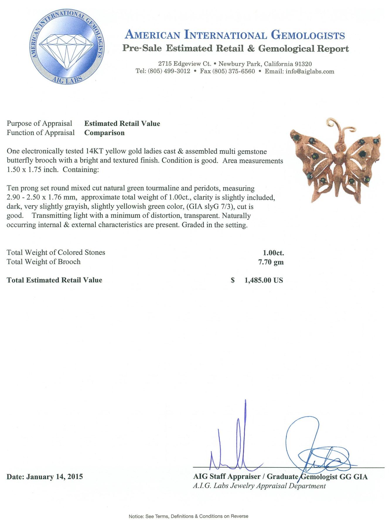 One electronically tested 14KT yellow gold ladies cast & assembled multi gemstone butterfly brooch with a bright and textured finish. Area measurements 1.50 x 1.75 inch. Condition is good. Containing: Ten prong set round mixed cut natural green tourmaline and peridots, measuring 2.90 - 2.50 x 1.76 mm, approximate total weight of 1.00ct., clarity is slightly included, dark, very slightly grayish, slightly yellowish green color, (GIA slyG 7/3), cut is good. Transmitting light with a minimum of distortion, transparent. Naturally occurring internal & external characteristics are present. Graded in the setting. Total Weight of Colored Stones 1.00ct. Total Weight of Brooch 7.70 grams. AIG Appraised.