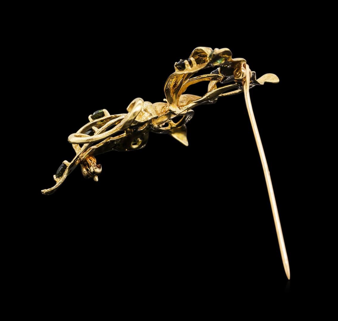One electronically tested 14KT yellow gold ladies cast & assembled multi gemstone butterfly brooch with a bright and textured finish. Area measurements 1.50 x 1.75 inch. Condition is good. Containing: Ten prong set round mixed cut natural green tourmaline and peridots, measuring 2.90 - 2.50 x 1.76 mm, approximate total weight of 1.00ct., clarity is slightly included, dark, very slightly grayish, slightly yellowish green color, (GIA slyG 7/3), cut is good. Transmitting light with a minimum of distortion, transparent. Naturally occurring internal & external characteristics are present. Graded in the setting. Total Weight of Colored Stones 1.00ct. Total Weight of Brooch 7.70 grams. AIG Appraised.
