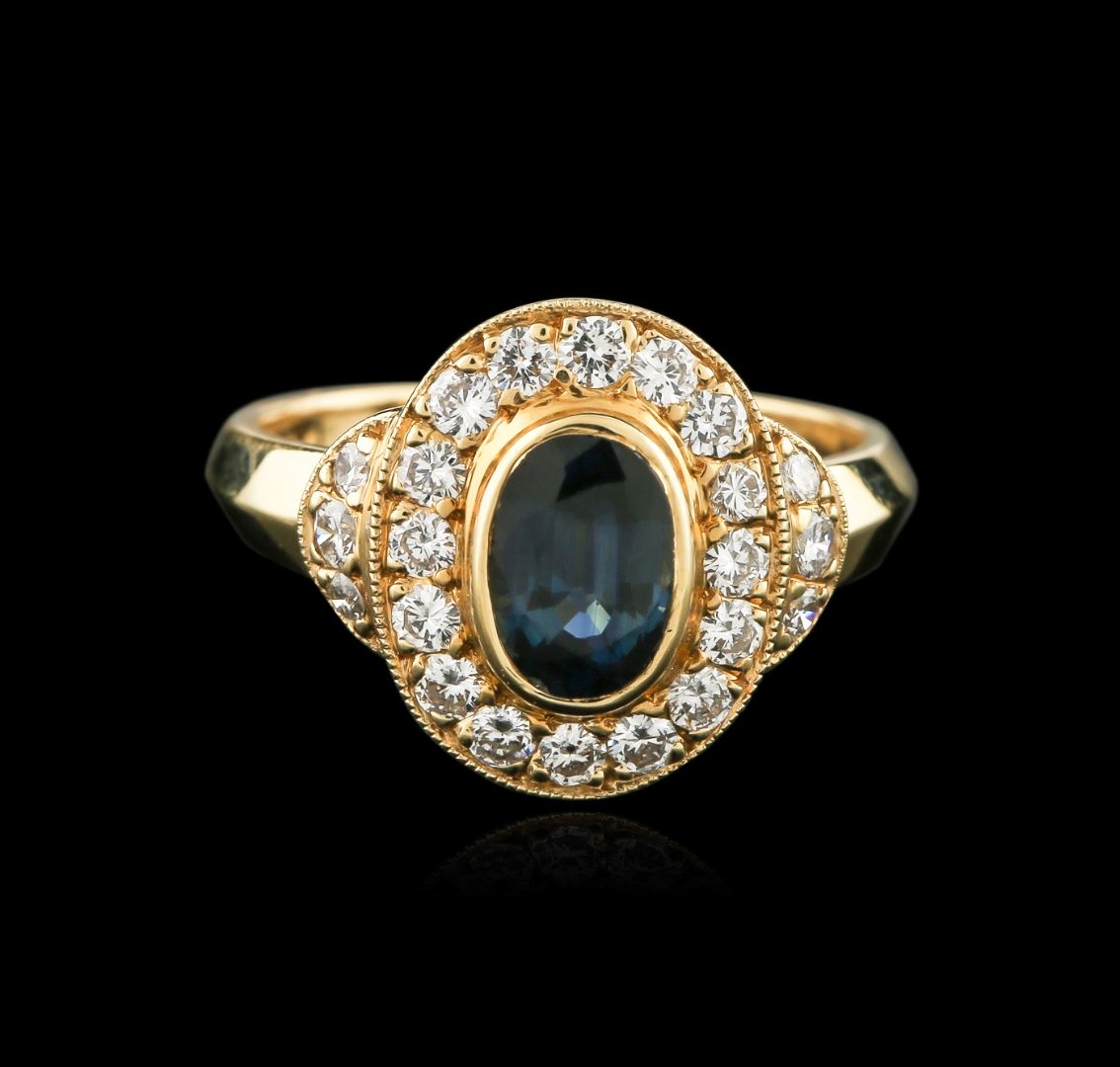 One ring featuring: Metal: 14k Solid Yellow Gold. Face Measurements: 14 x 14mm. Size: 6. Shank Width: 2.5mm. Finish: Bright Polish. Total Item Weight: 3.6 grams. Markings: Stamped 14K. Main Stone: Sapphire. Quantity: 1. Shape: Oval. Color: Blue. Carat Total Weight: 1.00. Measurements: 5 x 7mm. Treatment: None. Setting: Bezel. Hue: Blue. Saturation: Moderately Strong. Tone: Dark. Clarity: Type 2. Cut: Very Good. Secondary Stone: Diamond. Quantity: 22. Shape: Round. Color: White. Carat Total Weight: 0.60. Measurements: 1.4 - 1.9mm. Treatment: None. Setting: Prong. Color Grade: H - I. Clarity: SI1 - SI2. Cut: Very Good. Excellent Workmanship. Gemstones graded in the mounting. BHGL Appraised at $3,300.00.