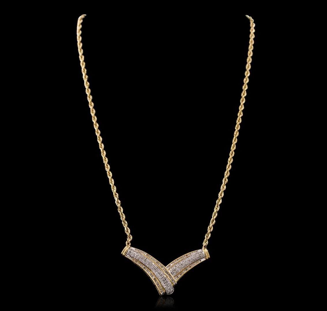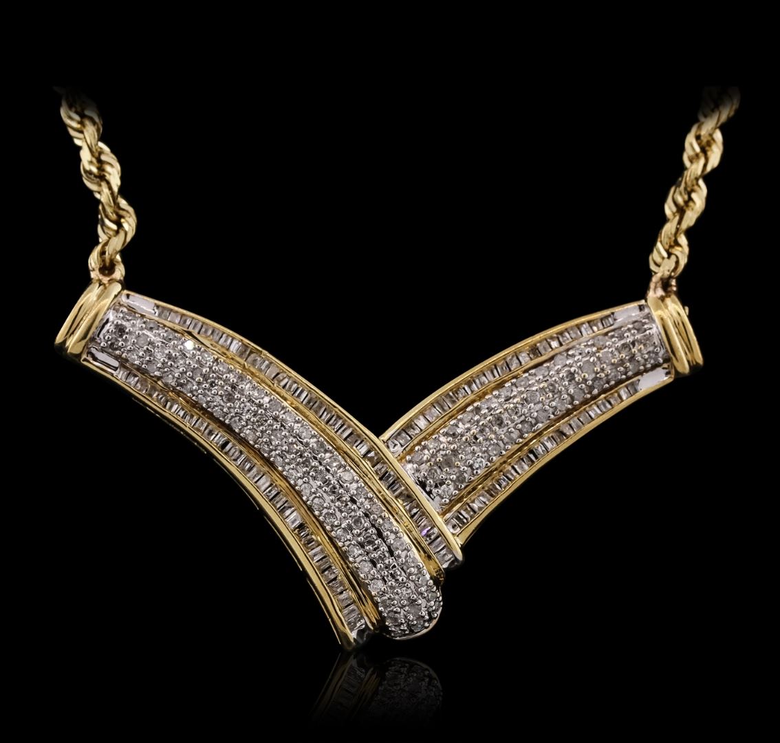 One necklace featuring: 14KT yellow gold weighing 16.10 grams containing round and baguette cut diamonds with a total weight of 1.00ct.