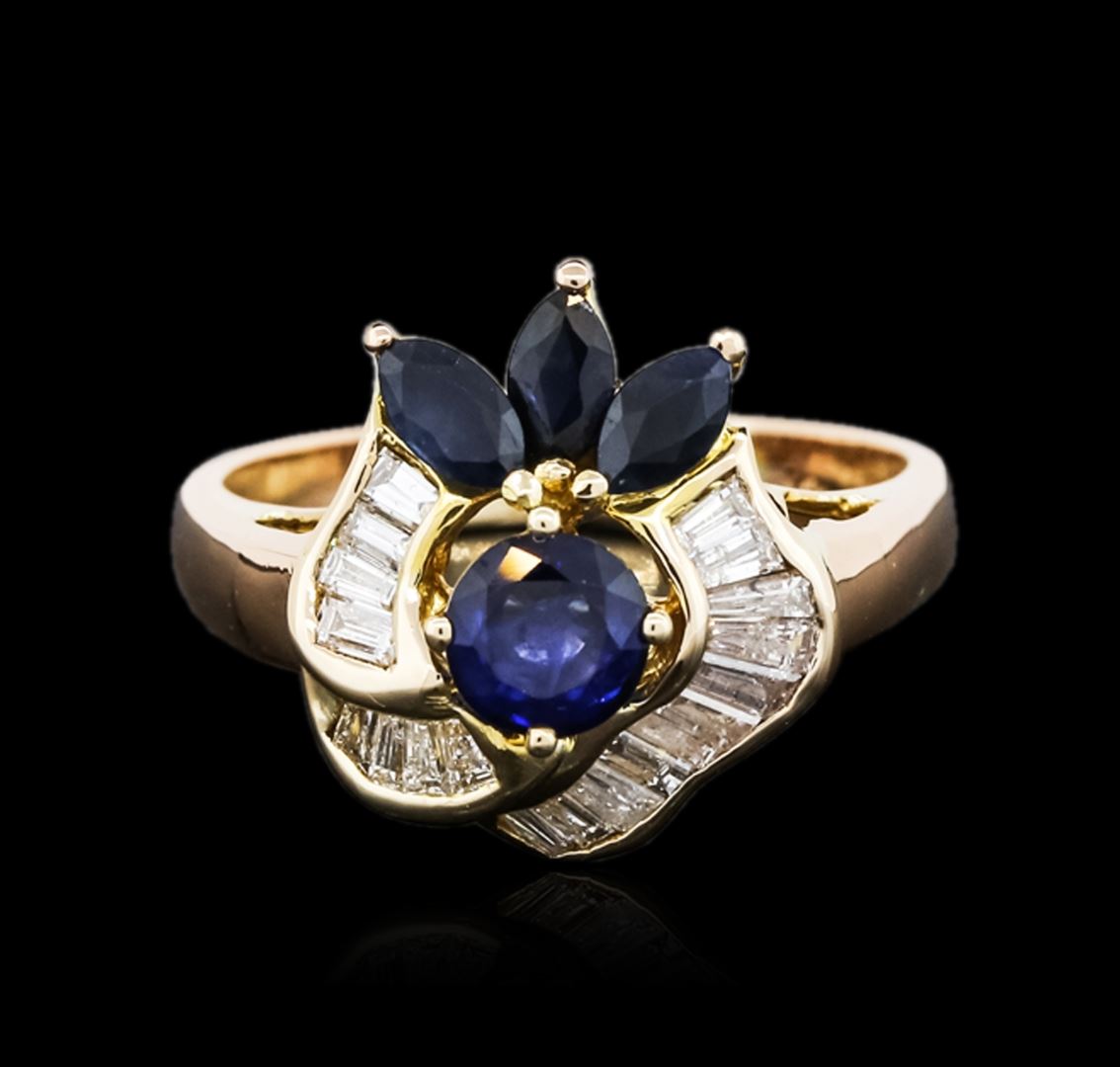 One ring featuring: 14KT yellow gold weighing 6.30 grams containing one sapphire center stone with a total weight of 0.66ct, three sapphire side stones with a total weight of 0.34cts, and baguette cut diamonds with a total weight of 0.50cts.