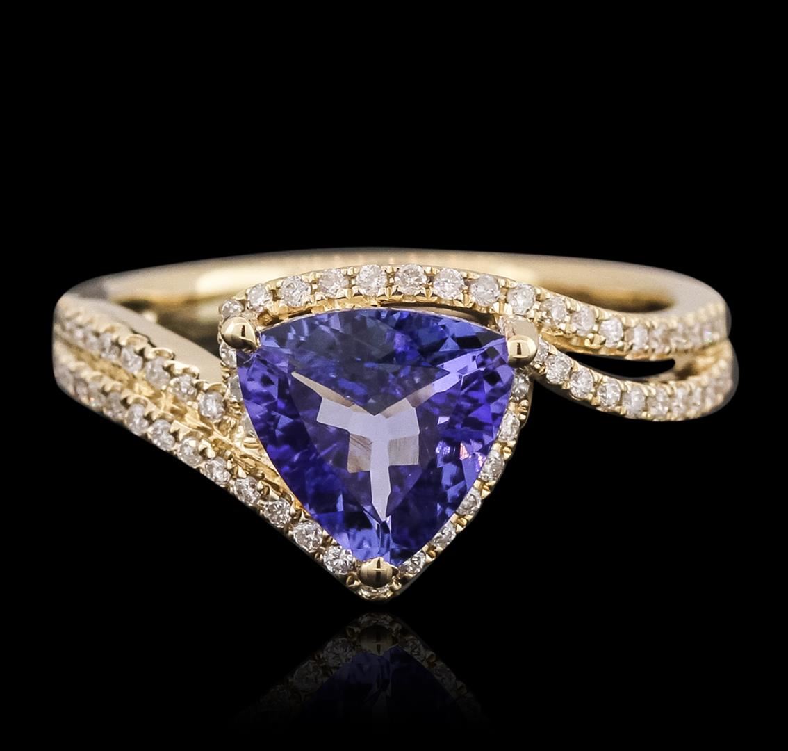 One electronically tested 14KT yellow gold ladies cast tanzanite and diamond ring with a bright polish finish. The featured tanzanite is set within a stylized diamond set bypass design, completed by a two and one-half millimeter wide band. Identified with markings of "14K". Condition is new, good workmanship. Containing: One prong set triangle mixed cut natural tanzanite, measuring 6.20 x 6.20 x 4.10mm, 8% bulge factor, approximate weight of 1.03ct., clarity is eye clean, type I, dark, very slightly grayish, violetish blue color, (GIA vB 7/3), cut is good. Transmitting light with no distortion, transparent. Graded in the setting. Tanzanite is a very rare gemstone that is only found in the country of Tanzania. Originally discovered in 1967. Tiffany & Company, named the stone Tanzanite. It is found in the Usumburu Mountains that border the Umba Valley of northern Tanzania. Tanzanite occurs in gray, brown, violet, blue, reddish-purple, & green. The gem is interesting because of its exceptional pleochroism. Rotated in different directions a tanzanite will exhibit multiple changes of color. Tanzanite has a low tolerance to ultrasonic cleaning, and should not be cleaned using this method. Sixty prong set round brilliant cut diamonds, measuring 1.10 - 1.00 x 0.63mm (depth est.) approximate total weight of 60 Stones = 0.35ct. Graded in the setting. Clarity: SI-2 to I-2. Color: G - I. Total Weight of Colored Stones 1.03ct. Total Weight of Diamonds 0.35ct. Total Weight of Ring 4.01 grams. AIG Appraised at $3,960.00.