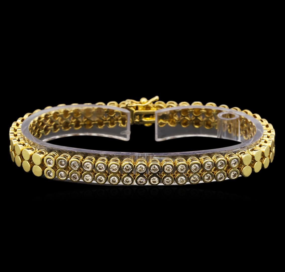 One electronically tested 14KT yellow gold ladies cast & assembled diamond bracelet with a bright polish finish. The seven inch wearable length bracelet features a double diamond set ribbon transitioning into matching yellow gold links, terminating in a concealed clasp with safety. Identified with markings of "14K". Condition is new, good workmanship. Containing: Thirty bezel set round brilliant cut diamonds, measuring 2.10 - 2.00 x 1.23mm (depth est.) approximate total weight of 30 Stones = 1.04ct. Graded in the setting. Clarity: SI-1 to I-1. Color: H - J. Total Weight of Diamonds 1.04ct. Total Weight of Bracelet 21.62 grams. AIG Appraised at $6,235.00.