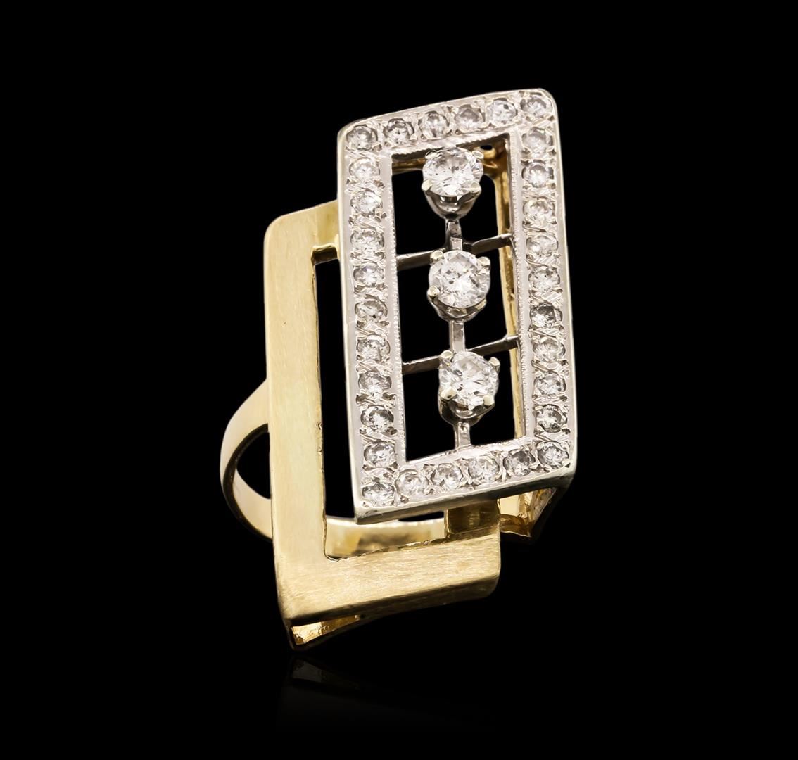 One electronically tested 14KT yellow gold ladies cast diamond ring with a bright polish finish. Identified with markings of "14K". Condition is new. Containing: Three prong set round brilliant cut diamonds, measuring 3.50 - 3.50 x 2.10mm (depth est.) approximate total weight of 3 Stones = 0.47ct. Clarity: SI-2. Color: H - I, Cut is Good. Thirty-Two prong set round brilliant cut diamonds, measuring 1.70 - 1.70 x 1.02mm (depth est.) approximate total weight of 32 Stones = 0.57ct. Clarity: SI-1 to I-1. Color: I - J, Cut is Good. All diamonds are graded in the mounting, unless otherwise stated. Total Weight of Diamonds 1.04ct. Total Weight of Ring 8.80 grams. GGL Appraised.