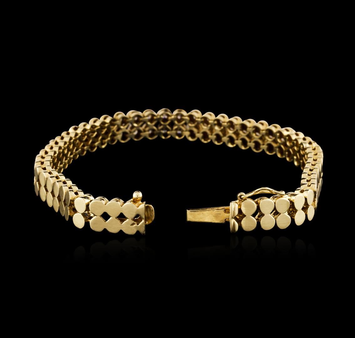 One electronically tested 14KT yellow gold ladies cast & assembled diamond bracelet with a bright polish finish. The seven inch wearable length bracelet features a double diamond set ribbon transitioning into matching yellow gold links, terminating in a concealed clasp with safety. Identified with markings of "14K". Condition is new, good workmanship. Containing: Thirty bezel set round brilliant cut diamonds, measuring 2.10 - 2.00 x 1.23mm (depth est.) approximate total weight of 30 Stones = 1.04ct. Graded in the setting. Clarity: SI-1 to I-1. Color: H - J. Total Weight of Diamonds 1.04ct. Total Weight of Bracelet 21.62 grams. AIG Appraised at $6,235.00.