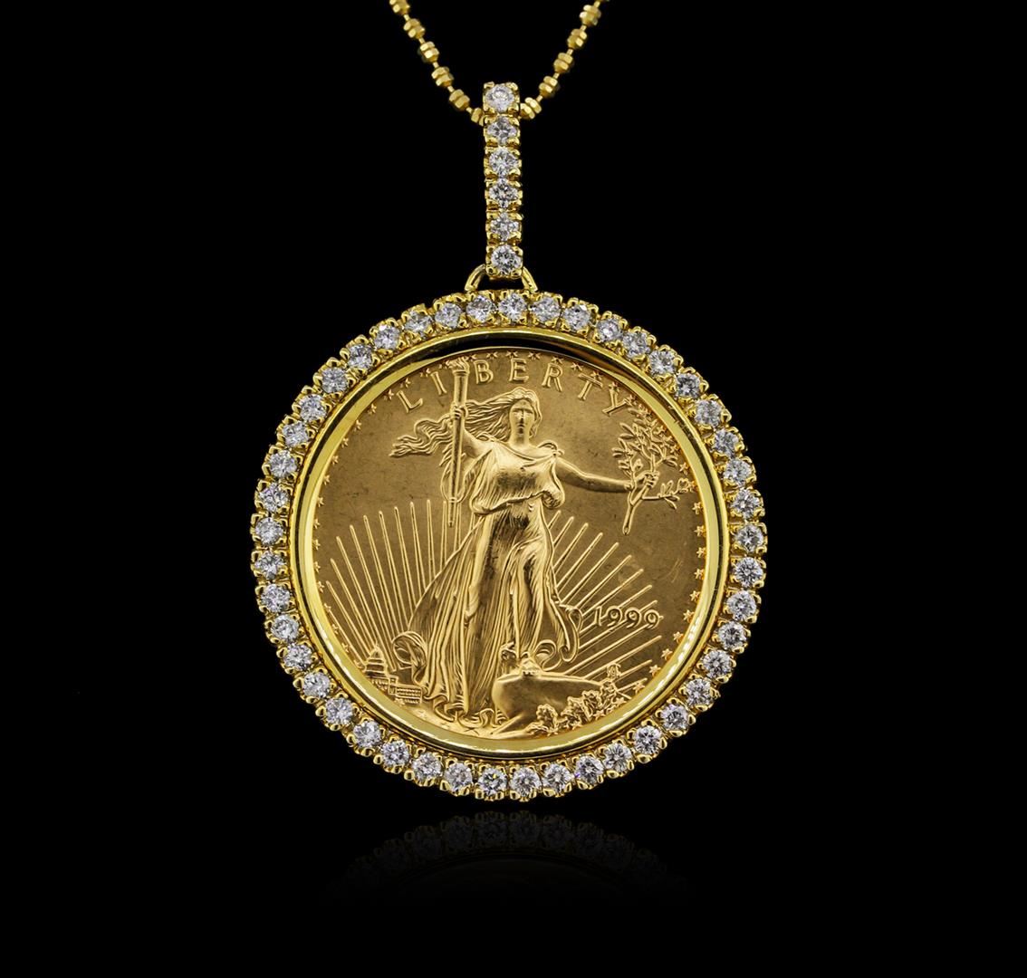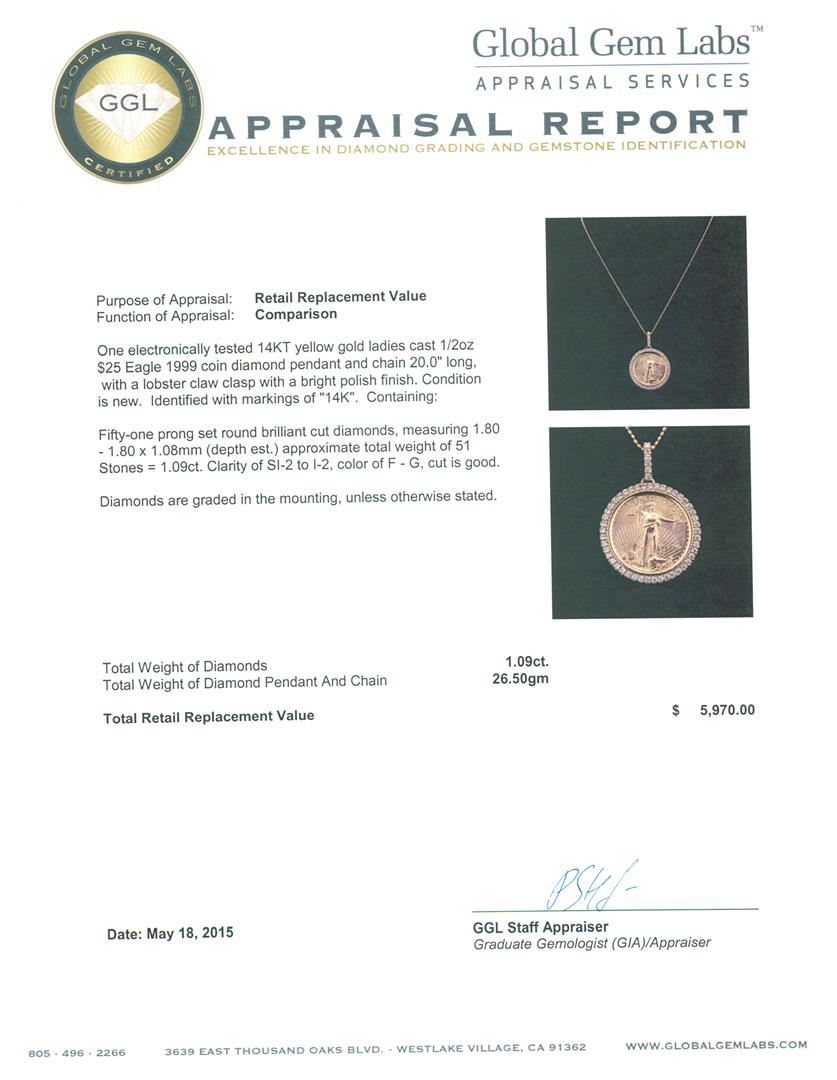 One electronically tested 14KT yellow gold ladies cast 1/2oz $25 Eagle 1999 coin diamond pendant and chain 20.0" long, with a lobster claw clasp with a bright polish finish. Identified with markings of "14K". Condition is new. Containing: Fifty-One prong set round brilliant cut diamonds, measuring 1.80 - 1.80 x 1.08mm (depth est.) approximate total weight of 51 Stones = 1.09ct. Clarity: SI-2 to I-2. Color: F - G, Cut is Good. Diamonds are graded in the mounting, unless otherwise stated. Total Weight of Diamonds 1.09ct. Total Weight of Diamond Pendant And Chain 26.50 grams. GGL Appraised at $5,970.00.