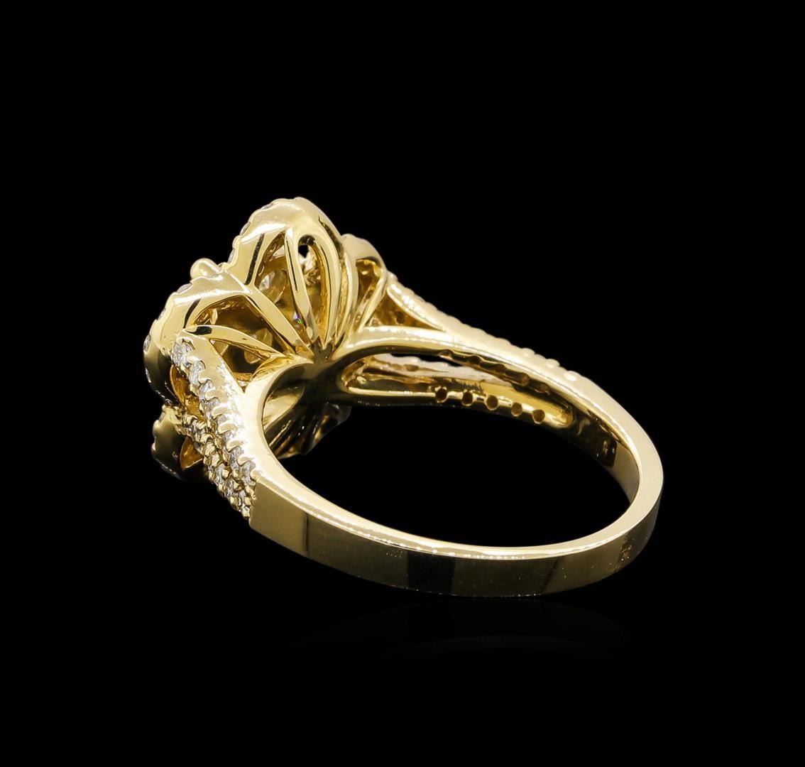 One electronically tested 14KT yellow gold ladies cast diamond ring with a bright polish finish. Identified with markings of "K14". Condition is new. Containing: Six prong set round brilliant cut diamonds, measuring 3.00 - 3.00 x 1.80mm (depth est.) approximate total weight of 6 Stones = 0.74ct. Clarity: SI-2 to I-2. Color: K - L, Cut is Good. Sixty-Two prong set round brilliant cut diamonds, measuring 1.00 - 1.00 x 0.60mm (depth est.) approximate total weight of 62 Stones = 0.40 ct. Clarity: I-1 to I-2. Color: K - L, Cut is Good. Diamonds are graded in the mounting, unless otherwise stated. Total Weight of Diamonds 1.14ct. Total Weight of Ring 4.80 grams. GGL Appraised.