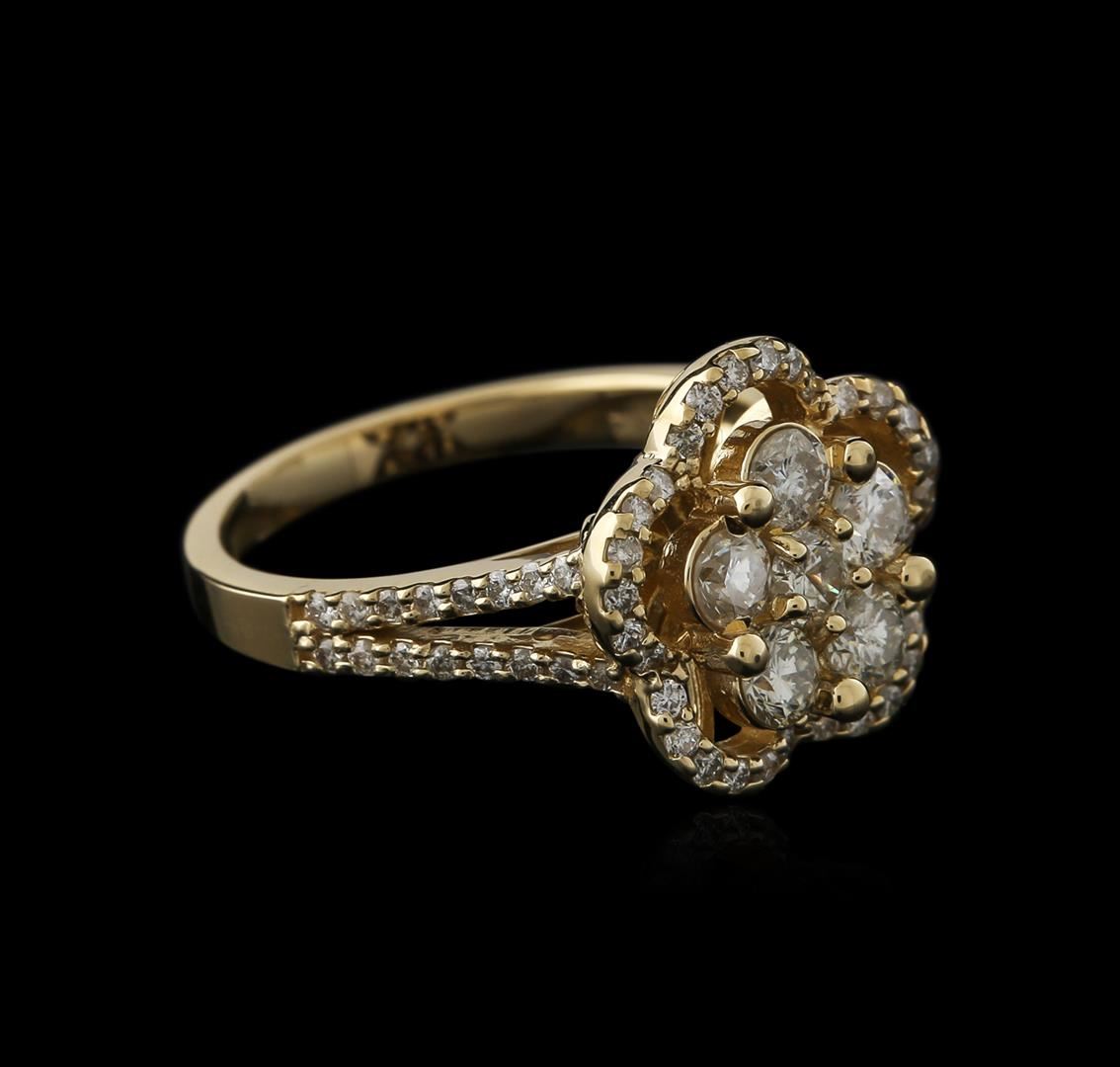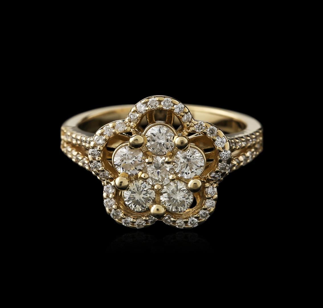 One electronically tested 14KT yellow gold ladies cast diamond ring with a bright polish finish. Identified with markings of "K14". Condition is new. Containing: Six prong set round brilliant cut diamonds, measuring 3.00 - 3.00 x 1.80mm (depth est.) approximate total weight of 6 Stones = 0.74ct. Clarity: SI-2 to I-2. Color: K - L, Cut is Good. Sixty-Two prong set round brilliant cut diamonds, measuring 1.00 - 1.00 x 0.60mm (depth est.) approximate total weight of 62 Stones = 0.40ct. Clarity: I-1 to I-2. Color: K - L, Cut is Good. Diamonds are graded in the mounting, unless otherwise stated. Total Weight of Diamonds 1.14ct. Total Weight of Ring 4.80 grams. GGL Appraised at $2,210.00.