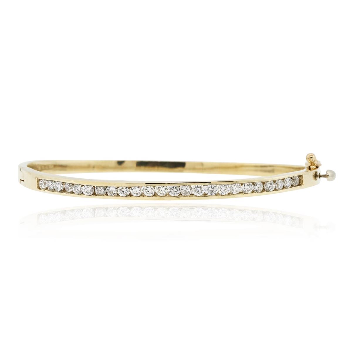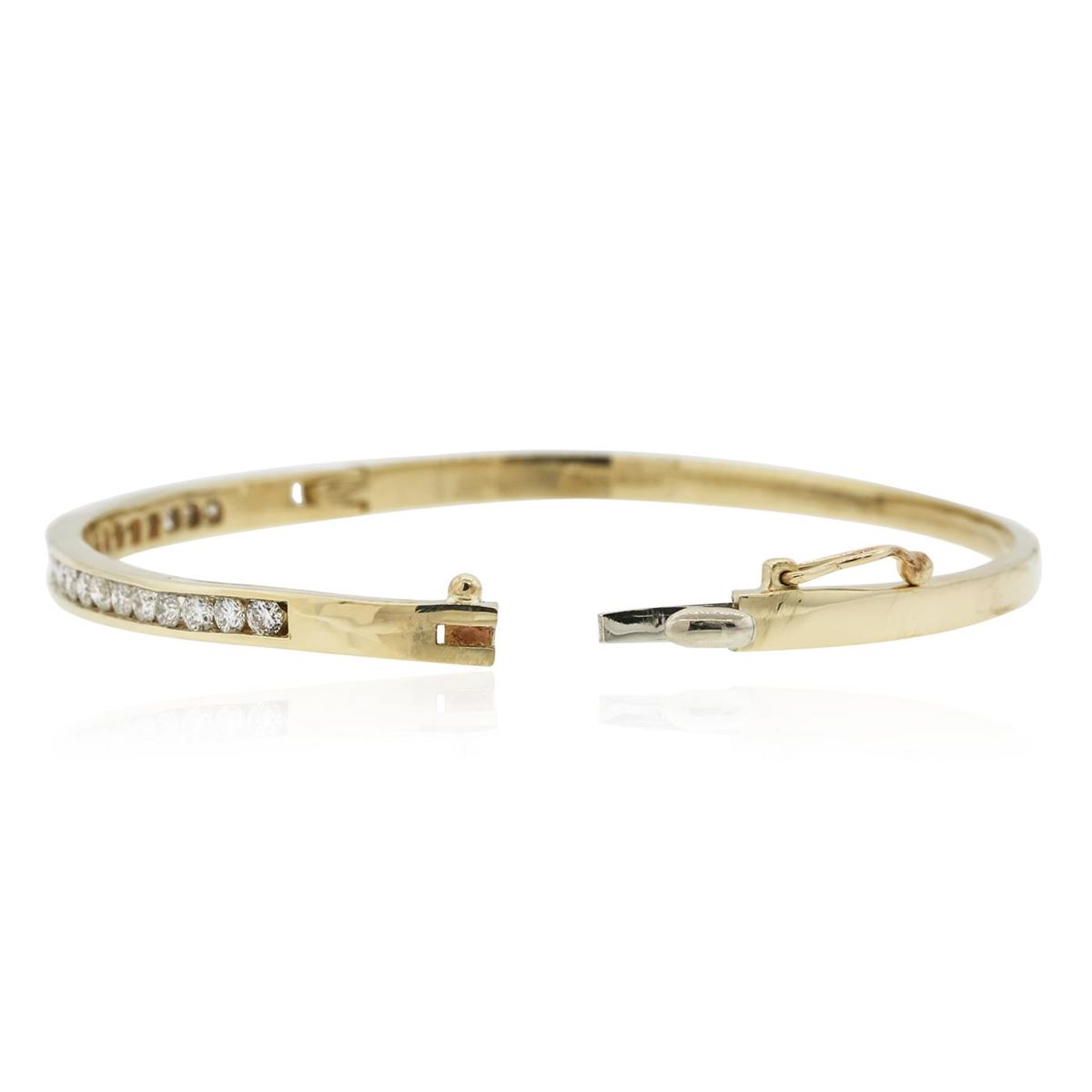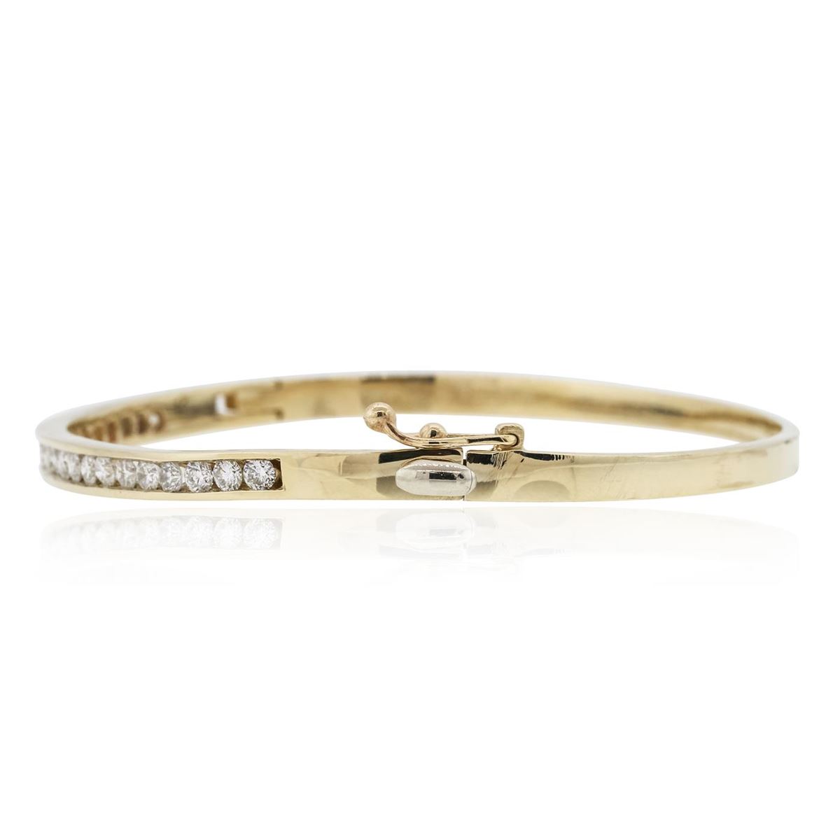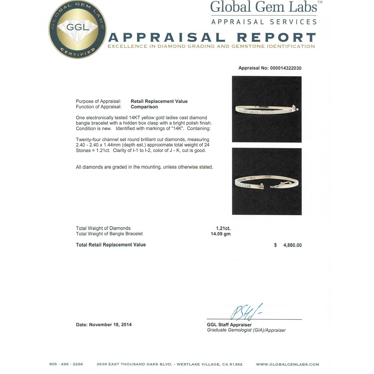 One electronically tested 14KT yellow gold ladies cast diamond bangle bracelet with a hidden box clasp with a bright polish finish. Identified with markings of "14K". Condition is new. Containing: Twenty-Four channel set round brilliant cut diamonds, measuring 2.40 - 2.40 x 1.44mm (depth est.) approximate total weight of 24 Stones = 1.21ct. Clarity: I-1 to I-2. Color: J - K, Cut is Good. All diamonds are graded in the mounting, unless otherwise stated. Total Weight of Diamonds 1.21ct. Total Weight of Bangle Bracelet 14.09 grams. GGL Appraised at $4,880.00.