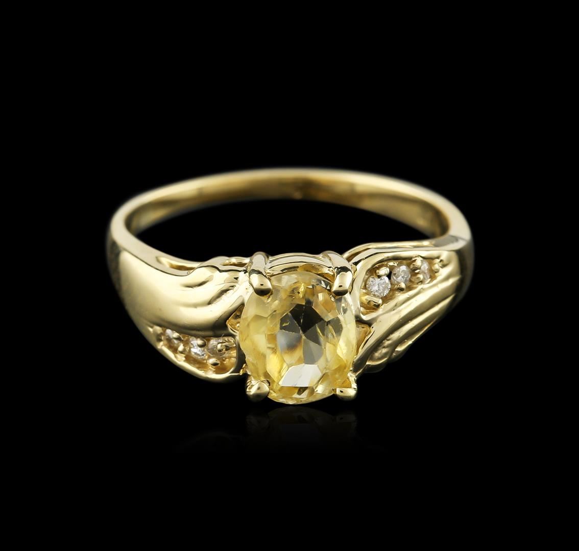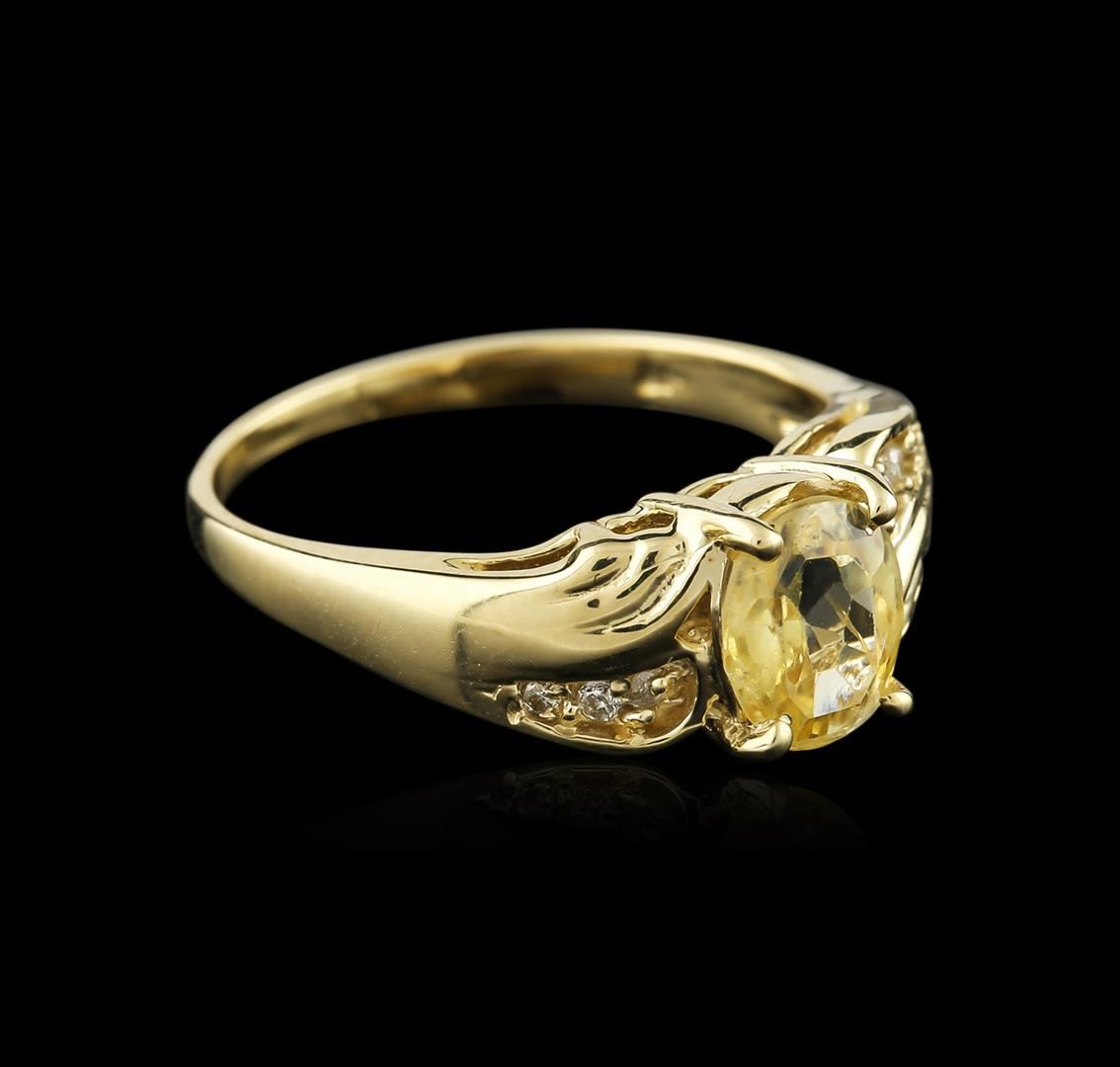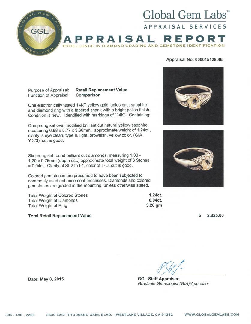 One electronically tested 14KT yellow gold ladies cast sapphire and diamond ring with a tapered shank with a bright polish finish. Identified with markings of "14K". Condition is new. Containing: One prong set oval modified brilliant cut natural yellow sapphire, measuring 6.98 x 5.77 x 3.66mm, approximate weight of 1.24ct., clarity is eye clean, type II, light, brownish, yellow color, (GIA Y 3/3), cut is good. Six prong set round brilliant cut diamonds, measuring 1.30 - 1.20 x 0.75mm (depth est.) approximate total weight of 6 Stones = 0.04ct. Clarity: SI-2 to I-1. Color: I - J, Cut is Good. Colored gemstones are presumed to have been subjected to commonly used enhancement processes. Diamonds and colored gemstones are graded in the mounting, unless otherwise stated. Total Weight of Colored Stones 1.24ct. Total Weight of Diamonds 0.04ct. Total Weight of Ring 3.20 grams. GGL Appraised at $2,825.00.
