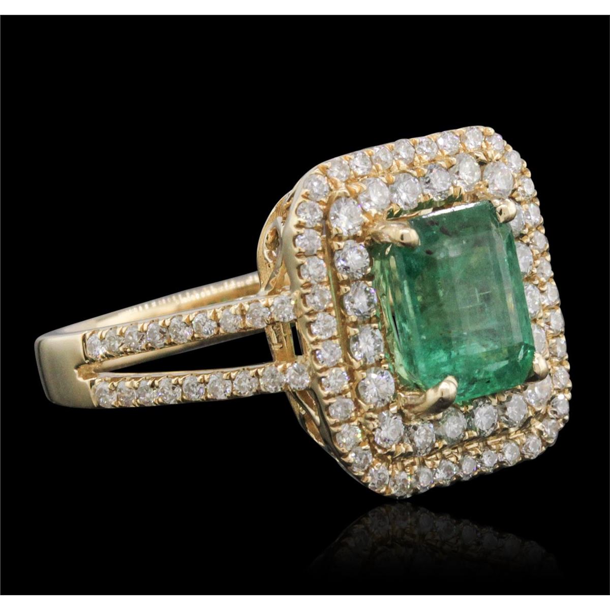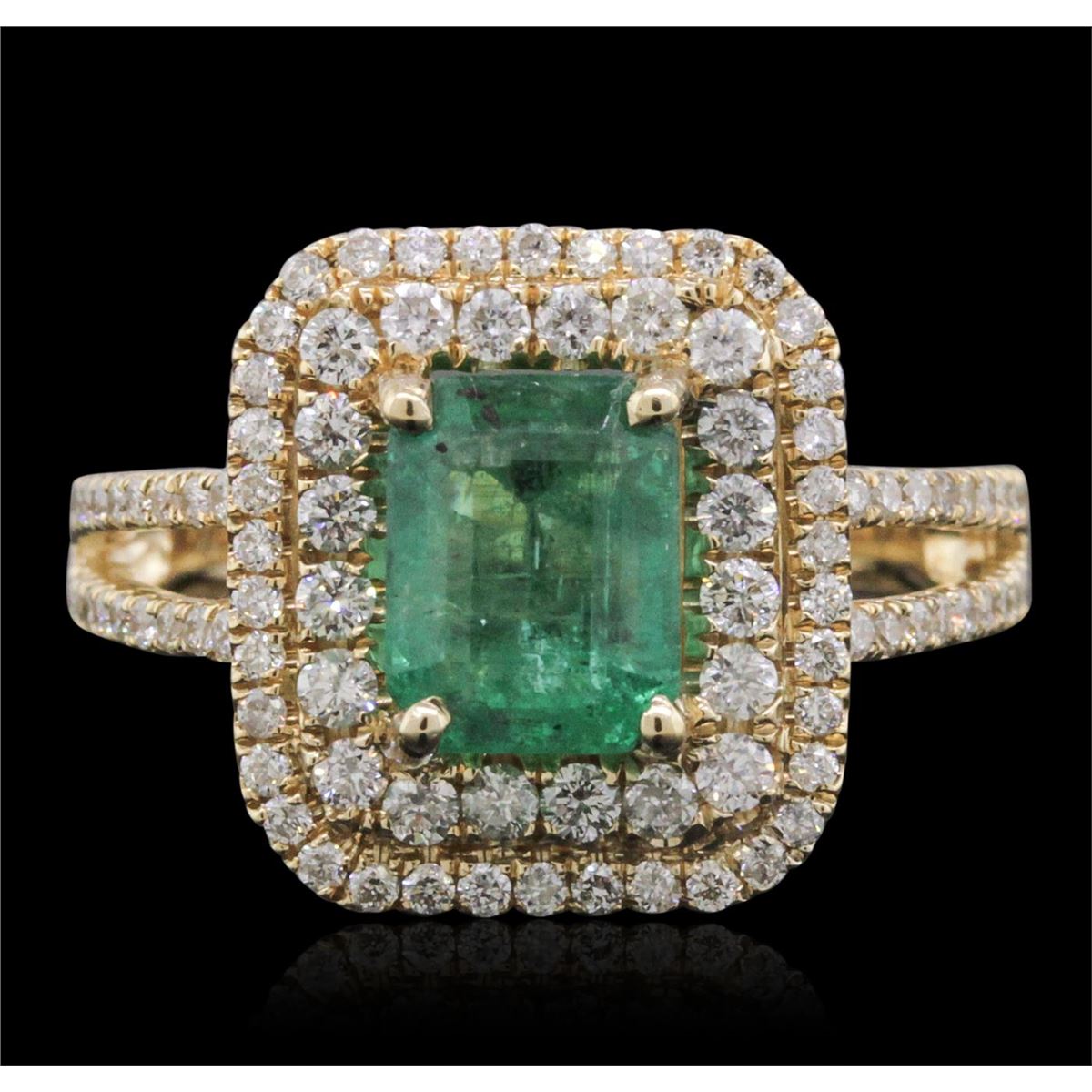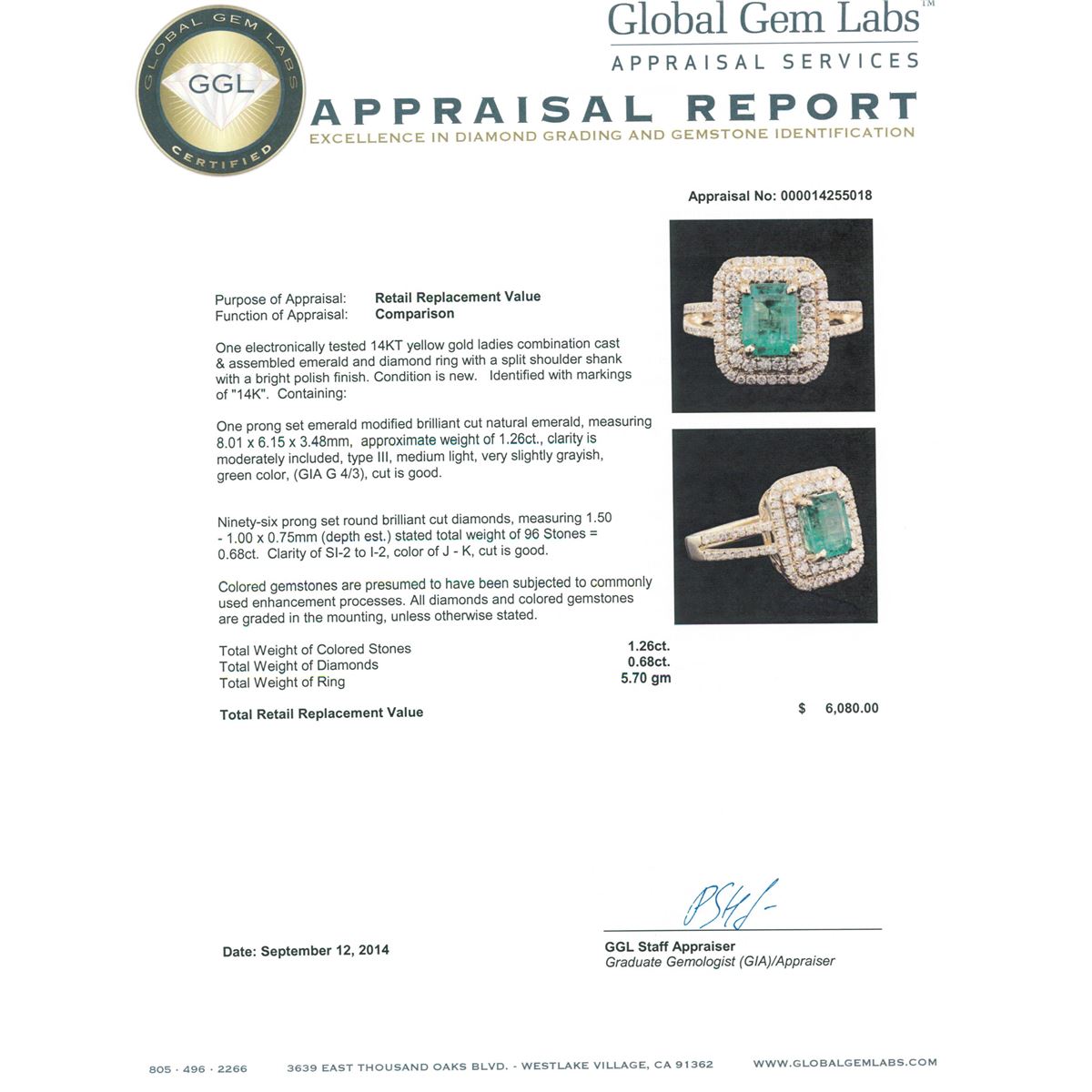 One electronically tested 14KT yellow gold ladies combination cast & assembled emerald and diamond ring with a split shoulder shank with a bright polish finish. Identified with markings of "14K". Condition is new. Containing: One prong set emerald modified brilliant cut natural emerald, measuring 8.01 x 6.15 x 3.48mm, approximate weight of 1.26ct., clarity is moderately included, type III, medium light, very slightly grayish, green color, (GIA G 4/3), cut is good. Ninety-Six prong set round brilliant cut diamonds, measuring 1.50 - 1.00 x 0.75mm (depth est.) stated total weight of 96 Stones = 0.68ct. Clarity: SI-2 to I-2. Color: J - K, Cut is Good. Colored gemstones are presumed to have been subjected to commonly used enhancement processes. All diamonds and colored gemstones are graded in the mounting, unless otherwise stated total weight of Colored Stones 1.26ct. Total Weight of Diamonds 0.68ct. Total Weight of Ring 5.70 grams. GGL Appraised at $6,080.00.
