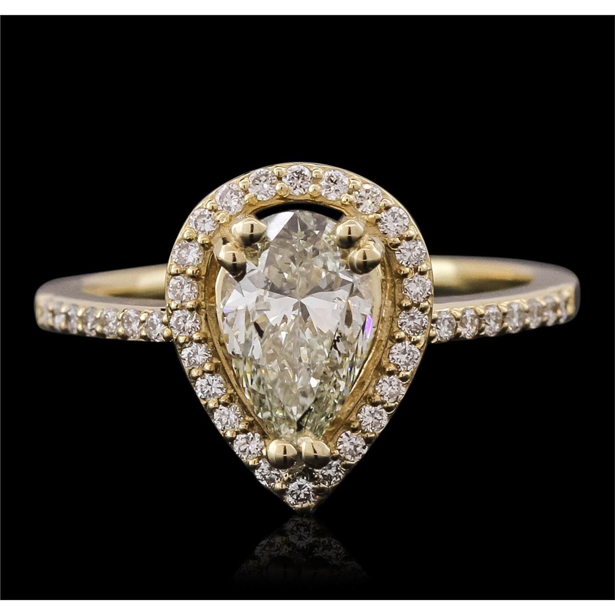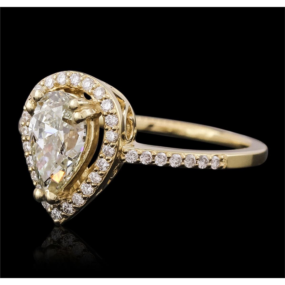 One electronically tested 14KT yellow gold ladies combination cast & assembled engagement ring with a flat shank with a bright polish finish. Identified with markings of "14K". Condition is new. Containing: One prong set pear shaped cut diamond, measuring 8.16 x 5.62 x 3.93mm (depth est.) approximate weight of 1.08ct. Clarity: SI-1. Color: M, Cut is Good. Thirty-Eight prong set round brilliant cut diamonds, measuring 1.10 - 1.10 x 0.66mm (depth est.) approximate total weight of 38 Stones = 0.18ct. Clarity: SI-1 to SI-2. Color: I, Cut is Good. All diamonds are graded in the mounting, unless otherwise stated. Total Weight of Diamonds 1.26ct. Total Weight of Ring 3.00 grams. GGL Appraised at $7,845.00.