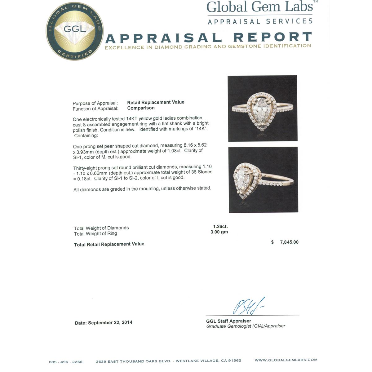 One electronically tested 14KT yellow gold ladies combination cast & assembled engagement ring with a flat shank with a bright polish finish. Identified with markings of "14K". Condition is new. Containing: One prong set pear shaped cut diamond, measuring 8.16 x 5.62 x 3.93mm (depth est.) approximate weight of 1.08ct. Clarity: SI-1. Color: M, Cut is Good. Thirty-Eight prong set round brilliant cut diamonds, measuring 1.10 - 1.10 x 0.66mm (depth est.) approximate total weight of 38 Stones = 0.18ct. Clarity: SI-1 to SI-2. Color: I, Cut is Good. All diamonds are graded in the mounting, unless otherwise stated. Total Weight of Diamonds 1.26ct. Total Weight of Ring 3.00 grams. GGL Appraised at $7,845.00.