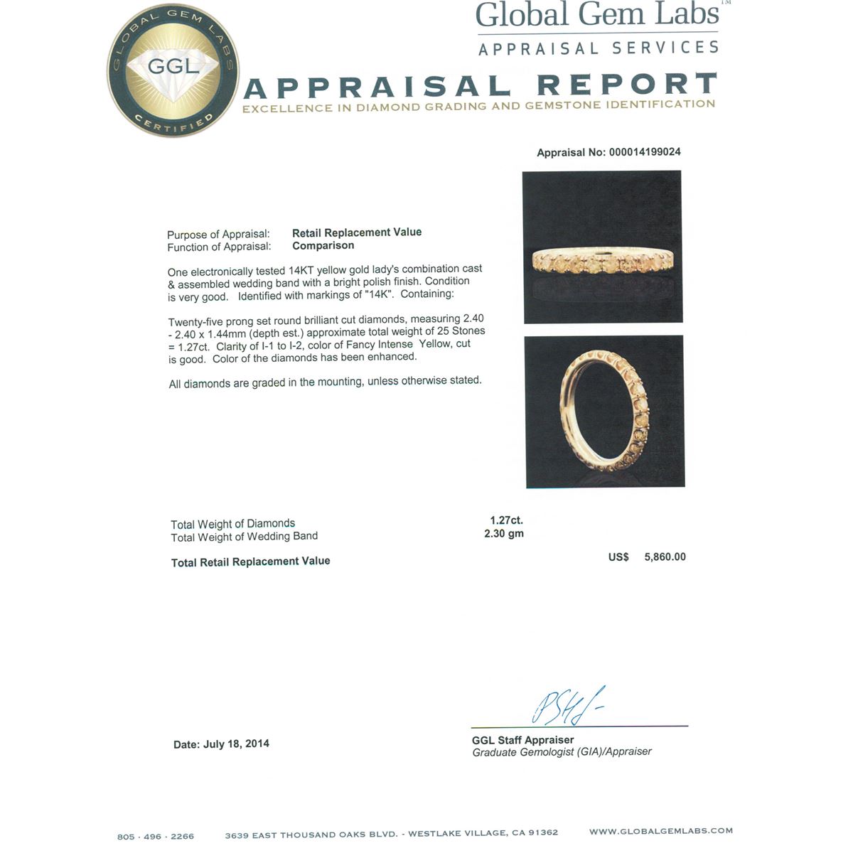 One electronically tested 14KT yellow gold Ladies combination cast & assembled wedding band with a bright polish finish. Condition is very good. Identified with markings of "14K". Containing: Twenty-Five prong set round brilliant cut diamonds, measuring 2.40 - 2.40 x 1.44mm (depth est.) approximate. Total Weight of 25 Stones = 1.27ct. Clarity: I-1 to I-2, Cut is Good. Color of the diamonds has been enhanced. All diamonds are graded in the mounting, unless otherwise stated. Total Weight of Diamonds 1.27ct. Total Weight of Wedding Band 2.30 grams.. GGL Appraised at $5,860.00.