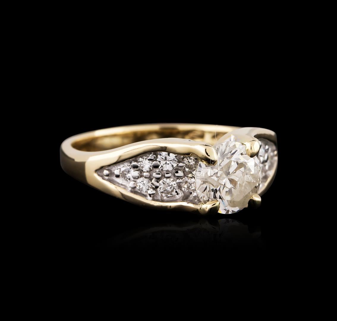 One electronically tested 14KT yellow gold ladies cast diamond engagement ring with a bright polish finish. Identified with markings of "14K". Condition is very good. Containing: One prong set round brilliant cut diamond, measuring 6.49 - 6.48 x 3.90mm (depth est.) approximate weight of 1.01ct. Clarity: I-3. Color: K, Cut is Good. Thirteen prong set round brilliant cut diamonds, measuring 2.20 - 1.30 x 1.05mm (depth est.) approximate total weight of 13 Stones = 0.26ct. Clarity: SI-1 to SI-2. Color: I - J, Cut is Good. All diamonds are graded in the mounting, unless otherwise stated. Total Weight of Diamonds 1.27ct. Total Weight of Engagement Ring 3.30 grams. GGL Appraised at $3,725.00.