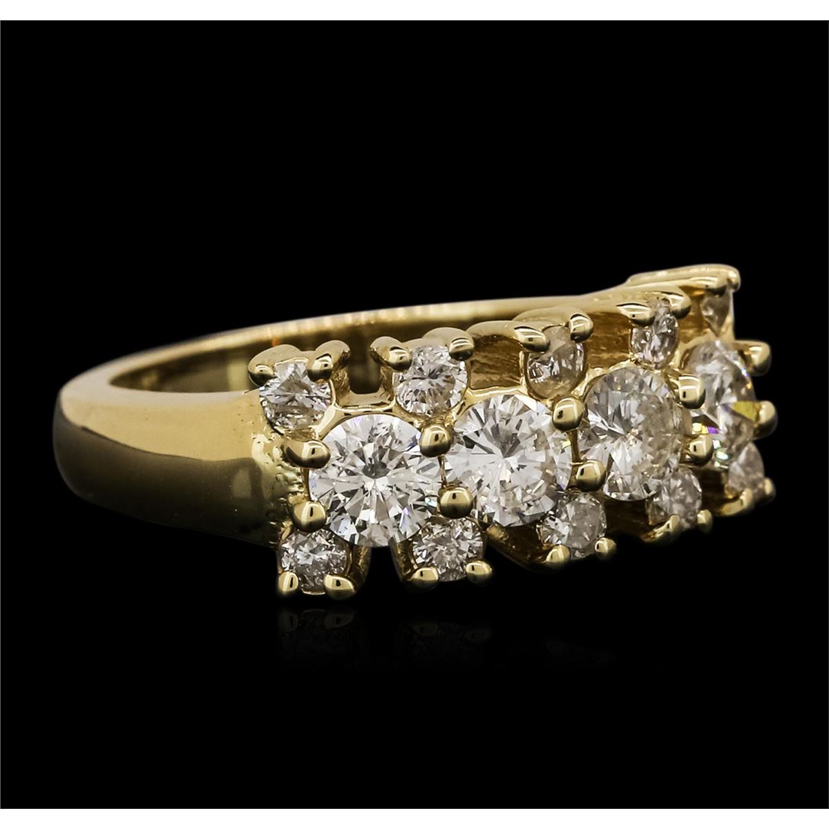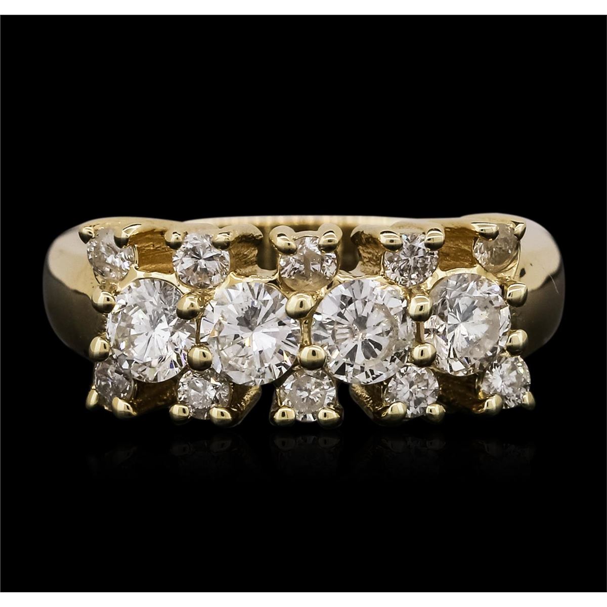 One electronically tested 14KT yellow gold ladies combination cast & assembled diamond ring with a bright polish finish. Identified with markings of "14K". Condition is new. Containing: Four prong set round brilliant cut diamonds, measuring 4.00 - 4.00 x 2.40mm (depth est.) approximate total weight of 4 Stones = 0.94ct. Clarity: I-1. Color: J, Cut is Good. Ten prong set round brilliant cut diamonds, measuring 2.10 - 2.10 x 1.26mm (depth est.) approximate total weight of 10 Stones = 0.34ct. Clarity: SI-1 to I-1. Color: J, Cut is Poor. All diamonds are graded in the mounting, unless otherwise stated. Total Weight of Diamonds 1.28ct. Total Weight of Ring 6.70 grams. GGL Appraised at $4,870.00.
