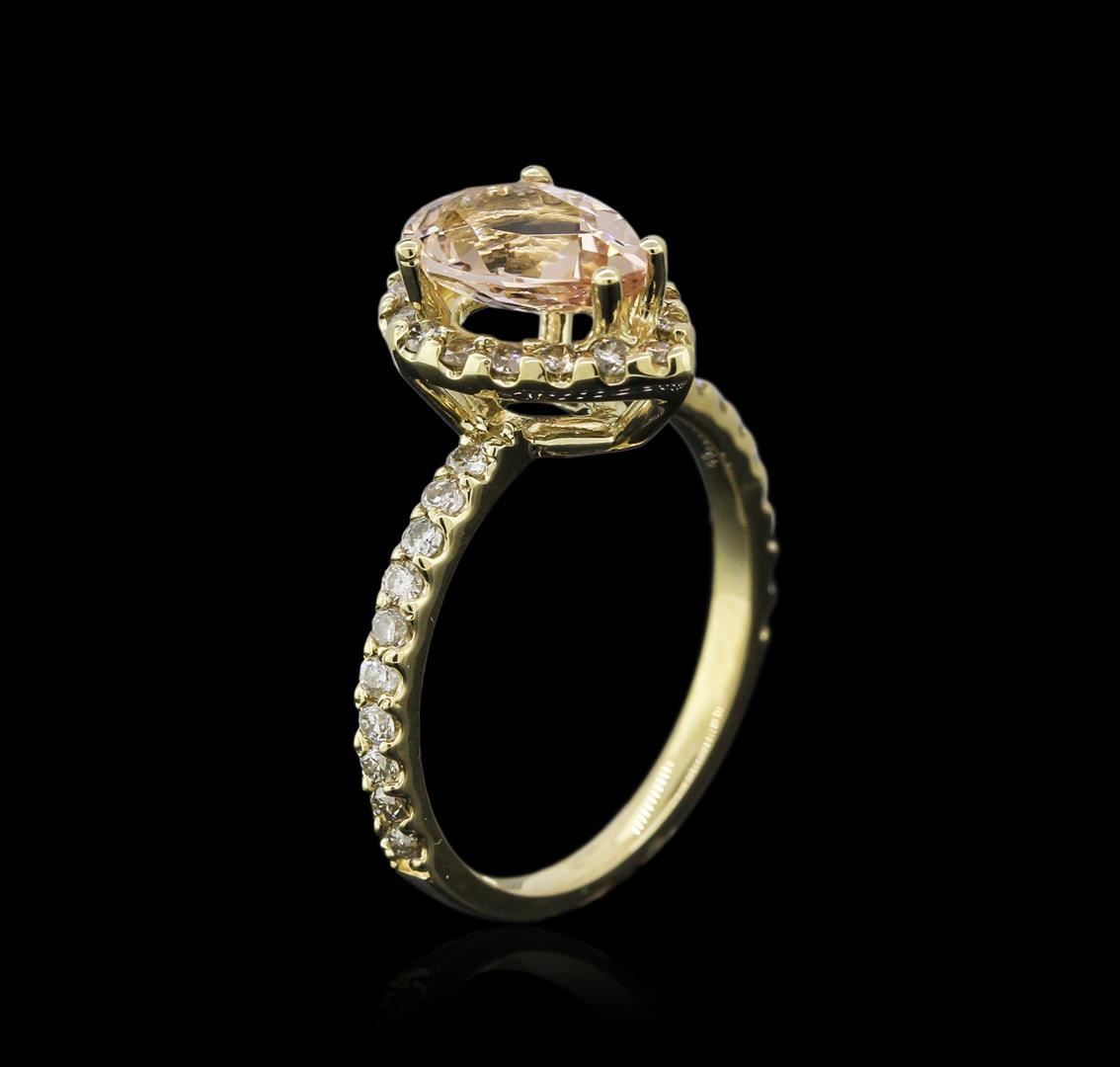 One electronically tested 14KT yellow gold ladies cast morganite and diamond ring with a flat shank with a bright polish finish. Identified with markings of "K14". Condition is new. Containing: One prong set pear modified brilliant cut natural morganite, measuring 9.67 x 6.54 x 3.76mm, approximate weight of 1.29ct., clarity is eye clean, type I, very light, brownish, reddish orange color, (GIA rO 2/1), cut is good. Thirty-Six prong set round brilliant cut diamonds, measuring 1.30 - 1.20 x 0.75mm (depth est.) approximate total weight of 36 Stones = 0.26ct. Clarity: I-1 to I-2. Color: J - K, Cut is Good. Diamonds and colored gemstones are graded in the mounting, unless otherwise stated. Colored gemstones are presumed to have been subjected to commonly used enhancement processes. Total Weight of Colored Stones 1.29ct. Total Weight of Diamonds 0.26ct. Total Weight of Ring 3.20 grams. GGL Appraised at $1,325.00.