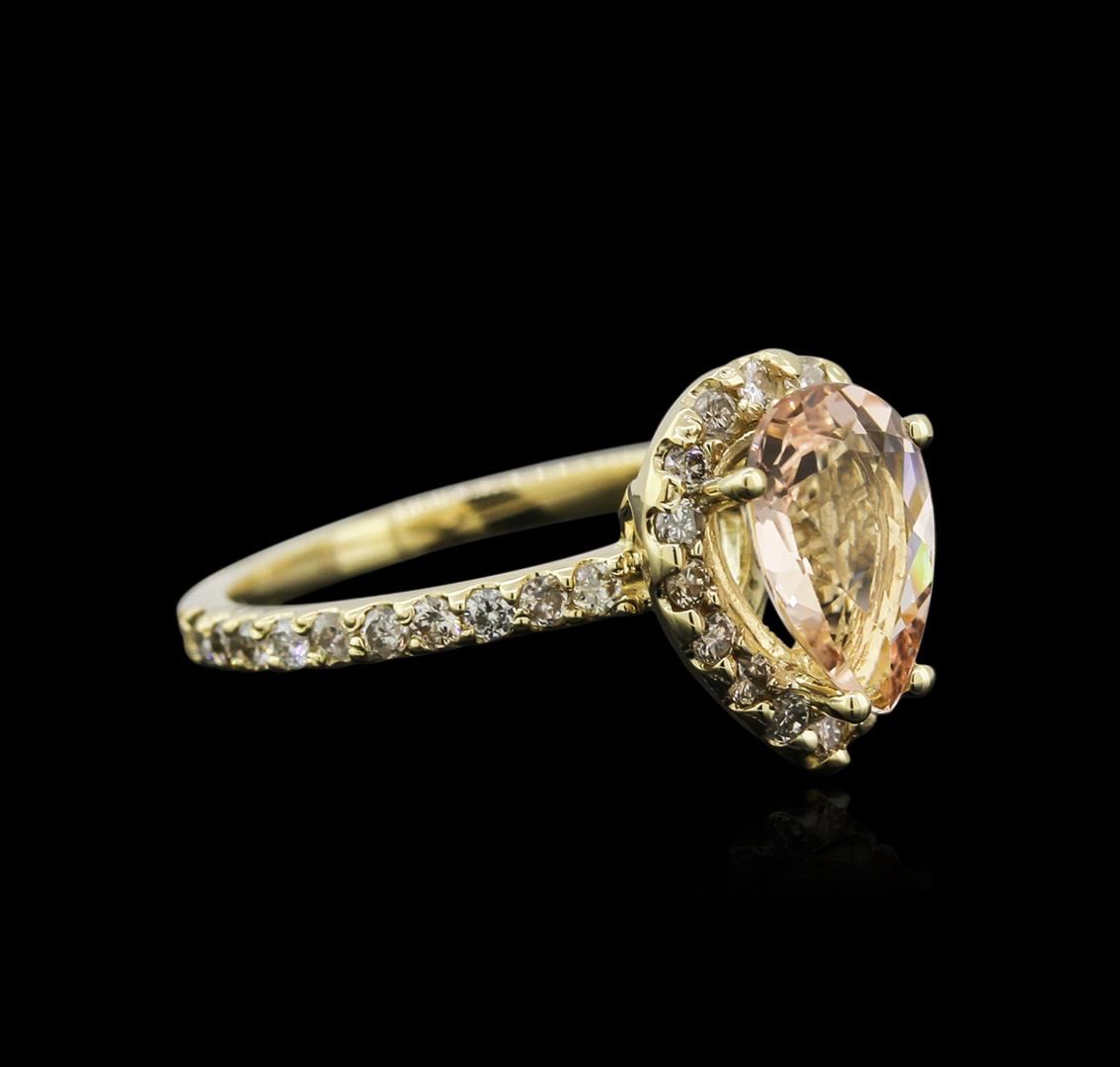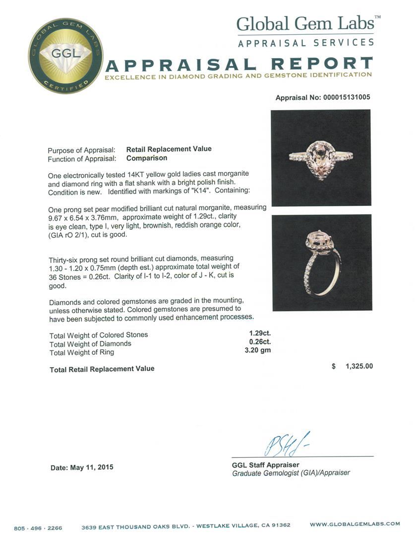 One electronically tested 14KT yellow gold ladies cast morganite and diamond ring with a flat shank with a bright polish finish. Identified with markings of "K14". Condition is new. Containing: One prong set pear modified brilliant cut natural morganite, GGL Appraised at $1,325.00.