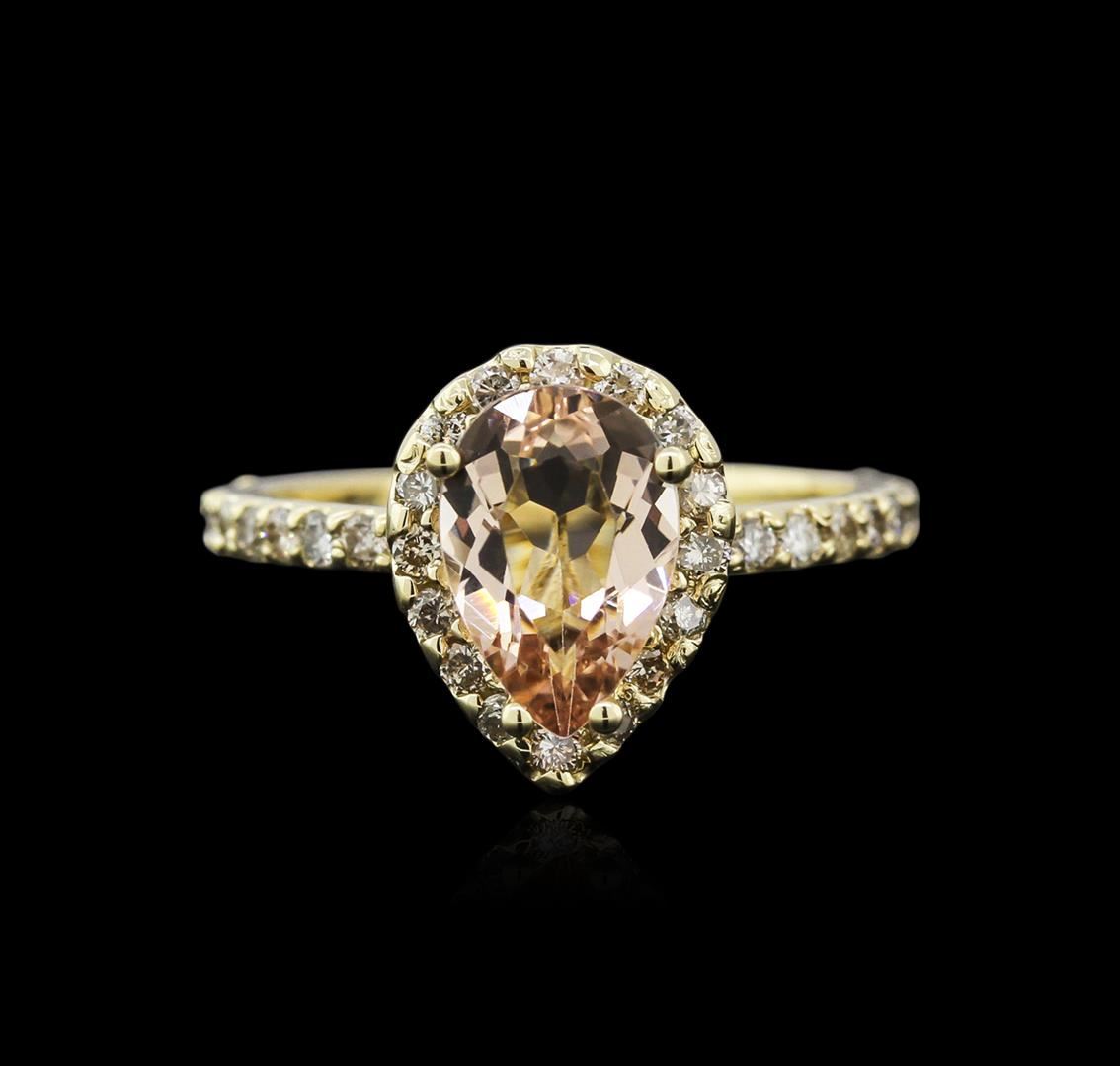 One electronically tested 14KT yellow gold ladies cast morganite and diamond ring with a flat shank with a bright polish finish. Identified with markings of "K14". Condition is new. Containing: One prong set pear modified brilliant cut natural morganite, measuring 9.67 x 6.54 x 3.76mm, approximate weight of 1.29ct., clarity is eye clean, type I, very light, brownish, reddish orange color, (GIA rO 2/1), cut is good. Thirty-Six prong set round brilliant cut diamonds, measuring 1.30 - 1.20 x 0.75mm (depth est.) approximate total weight of 36 Stones = 0.26ct. Clarity: I-1 to I-2. Color: J - K, Cut is Good. Diamonds and colored gemstones are graded in the mounting, unless otherwise stated. Colored gemstones are presumed to have been subjected to commonly used enhancement processes. Total Weight of Colored Stones 1.29ct. Total Weight of Diamonds 0.26ct. Total Weight of Ring 3.20 grams. GGL Appraised at $1,325.00.