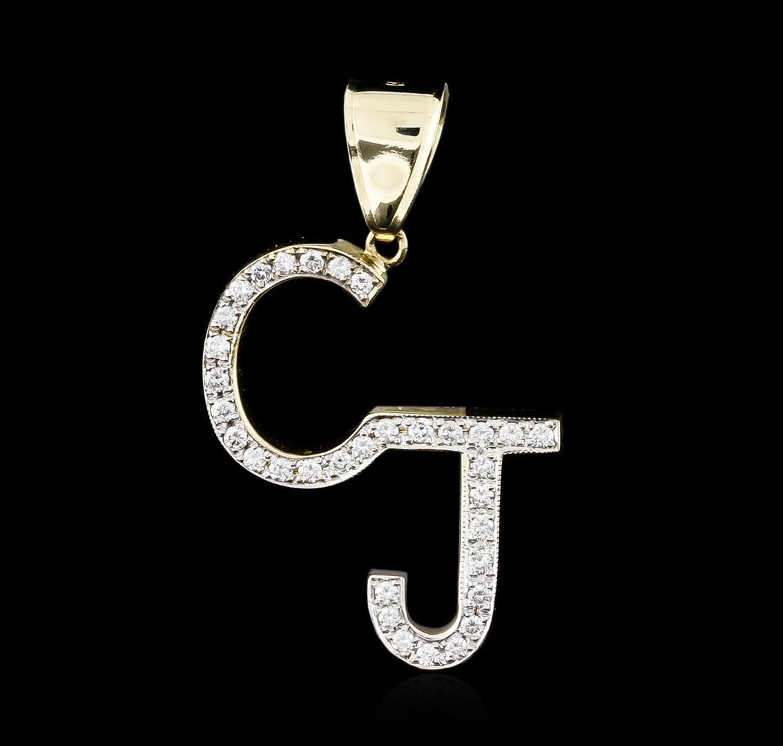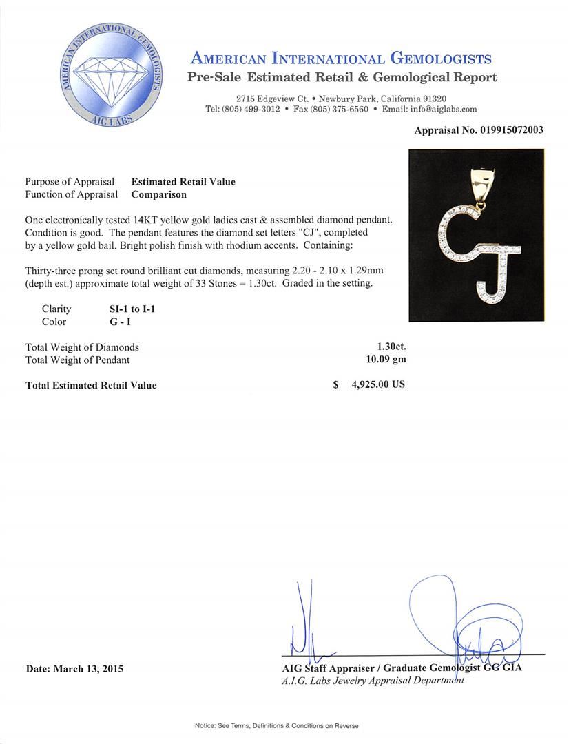 One electronically tested 14KT yellow gold ladies cast & assembled diamond pendant. The pendant features the diamond set letters "CJ", completed by a yellow gold bail. Bright polish finish with rhodium accents. Condition is good. Containing: Thirty-Three prong set round brilliant cut diamonds, measuring 2.20 - 2.10 x 1.29mm (depth est.) approximate total weight of 33 Stones = 1.30ct. Graded in the setting. Clarity: SI-1 to I-1. Color: G - I. Total Weight of Diamonds 1.30ct. Total Weight of Pendant 10.09 grams. AIG Appraised at $4,925.00.