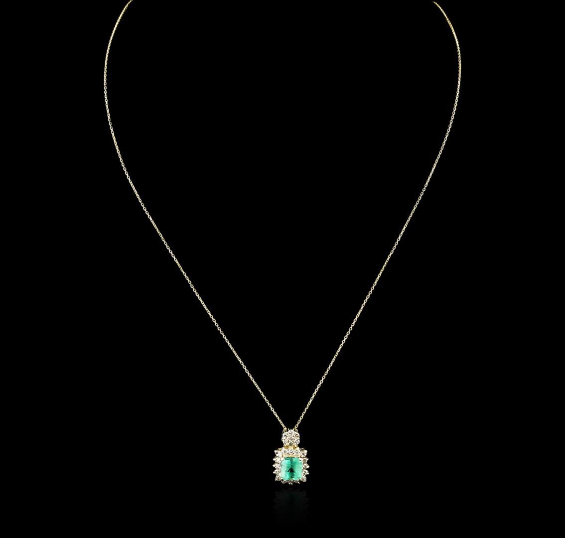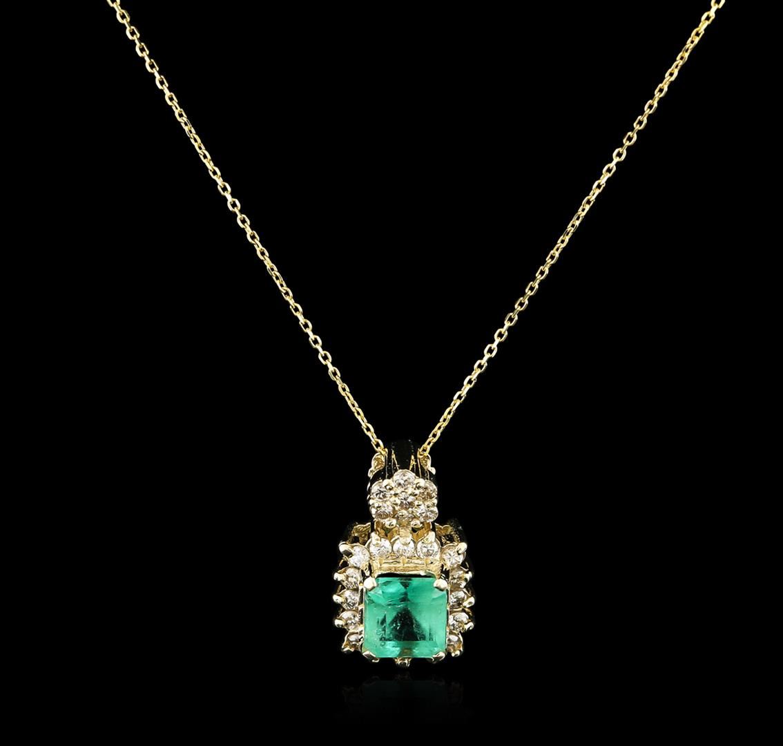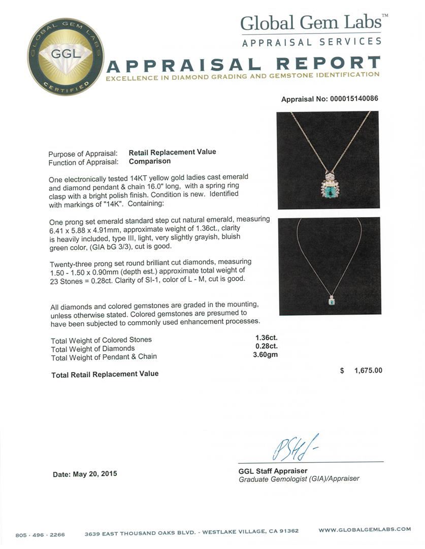 One electronically tested 14KT yellow gold ladies cast emerald and diamond pendant & chain 16.0" long, with a spring ring clasp with a bright polish finish. Identified with markings of "14K". Condition is new. Containing: One prong set emerald standard step cut natural emerald, measuring 6.41 x 5.88 x 4.91mm, approximate weight of 1.36ct., clarity is heavily included, type III, light, very slightly grayish, bluish green color, (GIA bG 3/3), cut is good. Twenty-Three prong set round brilliant cut diamonds, measuring 1.50 - 1.50 x 0.90mm (depth est.) approximate total weight of 23 Stones = 0.28ct. Clarity: SI-1. Color: L - M, Cut is Good. All diamonds and colored gemstones are graded in the mounting, unless otherwise stated. Colored gemstones are presumed to have been subjected to commonly used enhancement processes. Total Weight of Colored Stones 1.36ct. Total Weight of Diamonds 0.28ct. Total Weight of Pendant & Chain 3.60 grams. GGL Appraised at $1,675.00.