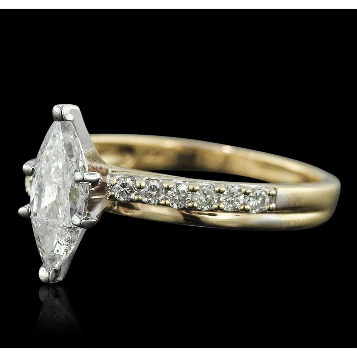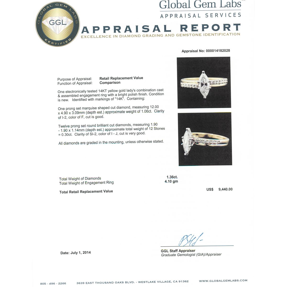 One electronically tested 14KT yellow gold Ladies combination cast & assembled engagement ring with a bright polish finish. Condition is new. Identified with markings of "14K". Containing: One prong set marquise shaped cut diamond, measuring 12.00 x 4.90 x 3.09mm (depth est.) approximate weight of 1.06ct. Clarity: I-2. Color: F, Cut is Good. Twelve prong set round brilliant cut diamonds, measuring 1.90 - 1.90 x 1.14mm (depth est.) approximate total weight of 12 Stones = 0.30ct. Clarity: SI-2. Color: I - J, Cut is Very Good. All diamonds are graded in the mounting, unless otherwise stated. Total Weight of Diamonds 1.36ct. Total Weight of Engagement Ring 4.10 grams. GGL Appraised at $9,440.00.