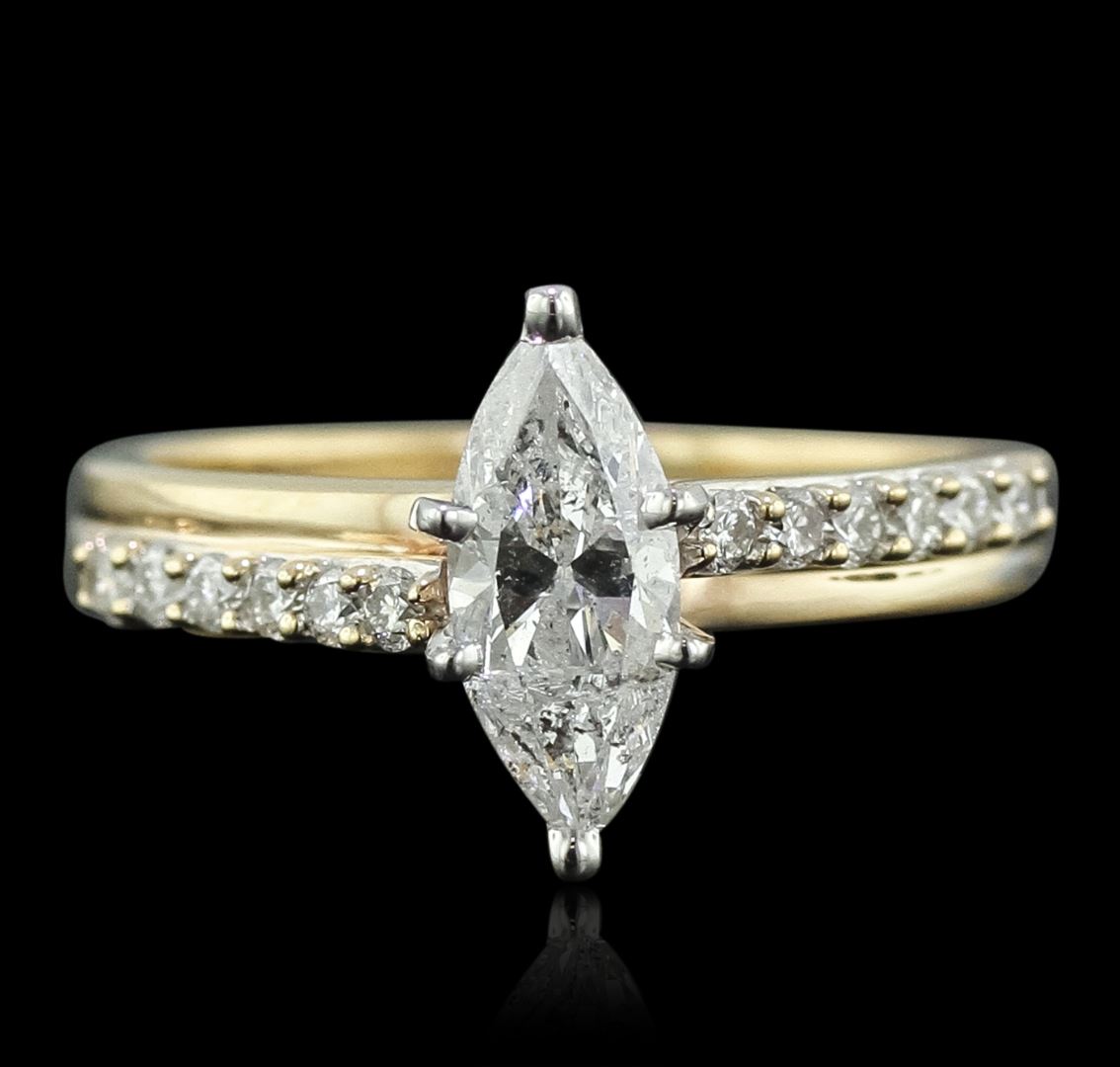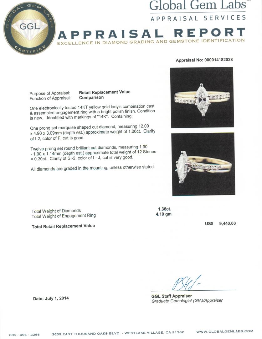 One electronically tested 14KT yellow gold Ladies combination cast & assembled engagement ring with a bright polish finish. Condition is new. Identified with markings of "14K". Containing: One prong set marquise shaped cut diamond, measuring 12.00 x 4.90 x 3.09mm (depth est.) approximate weight of 1.06ct. Clarity: I-2. Color: F, Cut is Good. Twelve prong set round brilliant cut diamonds, measuring 1.90 - 1.90 x 1.14mm (depth est.) approximate total weight of 12 Stones = 0.30ct. Clarity: SI-2. Color: I - J, Cut is Very Good. All diamonds are graded in the mounting, unless otherwise stated. Total Weight of Diamonds 1.36ct. Total Weight of Engagement Ring 4.10 grams. GGL Appraised at $9,440.00.