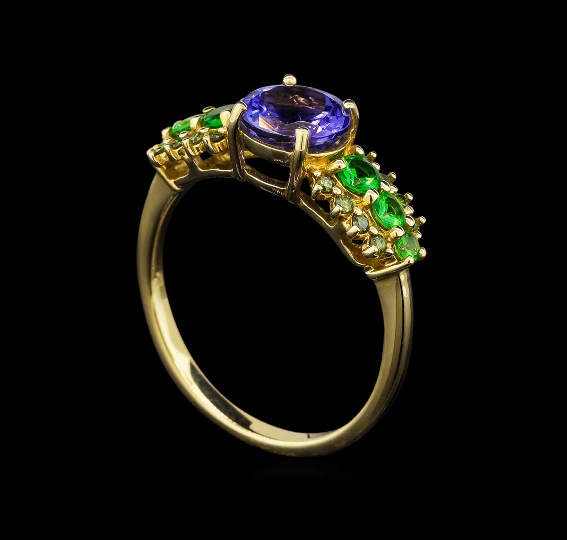 One electronically tested 14KT yellow gold ladies cast tanzanite and garnet ring with a bright polish finish. Identified with markings of "14K". Condition is new. Containing: One prong set round modified brilliant cut natural tanzanite, measuring 6.80 - 6.80 x 4.42 mm, approximate weight of 1.37ct., clarity is eye clean, type I, medium light, very slightly grayish, violet color, (GIA V 4/3), cut is good. Six prong set round modified brilliant cut natural tsavorite garnets, measuring 2.80 - 1.80 x 1.50 mm, approximate total weight of 0.48ct., clarity is slightly included, type II, medium, moderately strong, green color, (GIA G 5/4), cut is good. Sixteen prong set round modified brilliant cut natural diopsides, measuring 1.30 - 1.30 x 0.85 mm, approximate total weight of 0.16ct., clarity is slightly included, medium dark, very slightly grayish, green color, (GIA G 6/3), cut is good. Colored gemstones are presumed to have been subjected to commonly used enhancement processes. All colored gemstones are graded in the mounting, unless otherwise stated. Total Weight of Colored Stones 2.01ct. Total Weight of Ring 2.90 grams. GGL Appraised at $1,840.00.