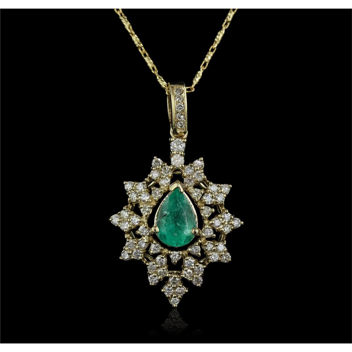 One electronically tested 14KT yellow gold ladies cast & assembled emerald and diamond pendant with chain. Condition is new, good workmanship. The pendant features an emerald set within a floral diamond bezel, completed by a diamond set bail. The pendant is supported by an eighteen inch length 14KT yellow gold designer style chain terminating in a lobster claw clasp. Identified with markings of "14K". Containing: One prong set pear mixed cut natural emerald, measuring 9.30 x 6.00 x 4.30mm, 5%. bulge factor, approximate weight of 1.37ct., clarity is heavily included, type III, medium, very slightly grayish, very slightly bluish green color, (GIA vslbG 5/3), cut is good. Transmitting light with a minimum of distortion, transparent to translucent. Naturally occurring internal & external characteristics are present. Indications of oil residue. Graded in the setting. Sixty prong & bead set round brilliant cut diamonds, measuring 2.40 - 1.30 x 1.11mm (depth est.) approximate. Total Weight of 60 Stones = 0.71ct. Graded in the setting. Clarity: SI-2 to I-2. Color: G - I. Total Weight of Colored Stones 1.37ct. Total Weight of Diamonds 0.71ct. Total Weight of Pendant With Chain 8.00 grams. AIG Appraised at $4,415.00.