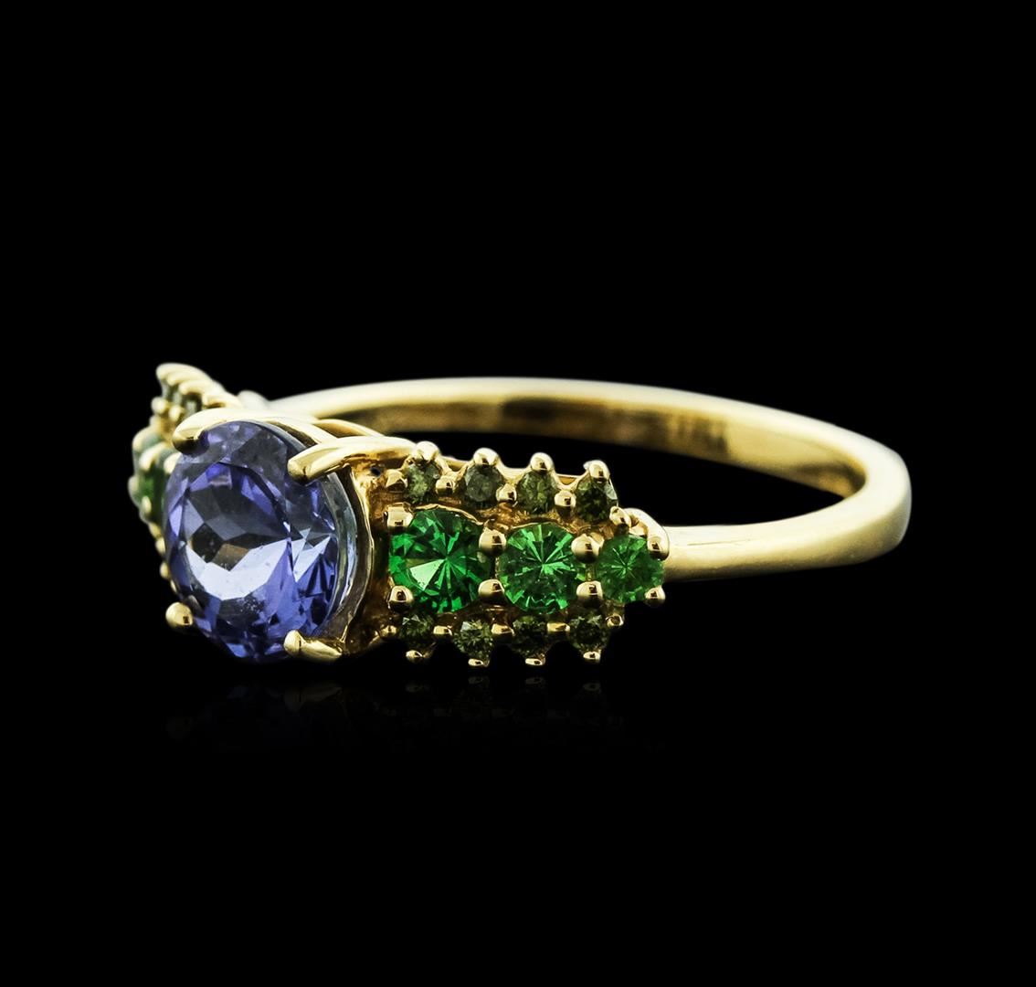 One electronically tested 14KT yellow gold ladies cast tanzanite and garnet ring with a bright polish finish. Identified with markings of "14K". Condition is new. Containing: One prong set round modified brilliant cut natural tanzanite, measuring 6.80 - 6.80 x 4.42 mm, approximate weight of 1.37ct., clarity is eye clean, type I, medium light, very slightly grayish, violet color, (GIA V 4/3), cut is good. Six prong set round modified brilliant cut natural tsavorite garnets, measuring 2.80 - 1.80 x 1.50 mm, approximate total weight of 0.48ct., clarity is slightly included, type II, medium, moderately strong, green color, (GIA G 5/4), cut is good. Sixteen prong set round modified brilliant cut natural diopsides, measuring 1.30 - 1.30 x 0.85 mm, approximate total weight of 0.16ct., clarity is slightly included, medium dark, very slightly grayish, green color, (GIA G 6/3), cut is good. Colored gemstones are presumed to have been subjected to commonly used enhancement processes. All colored gemstones are graded in the mounting, unless otherwise stated. Total Weight of Colored Stones 2.01ct. Total Weight of Ring 2.90 grams. GGL Appraised at $1,840.00.
