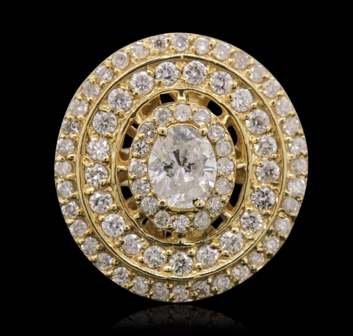 One electronically tested 14KT yellow gold Ladies engagement ring with a bright polish finish. Condition is new. Identified with markings of "K14". Containing: One prong set oval shaped cut diamond, measuring 6.40 x 5.10 x 3.21mm (depth est.) approximate weight of 0.66ct. Clarity: I-2. Color: J, Cut is Good. Seventy-Two prong set round brilliant cut diamonds, measuring 1.50 - 1.30 x 0.84mm (depth est.) approximate. Total Weight of 72 Stones = 0.72ct. Clarity: I-1 to I-2. Color: I - J, Cut is Good. Total Weight of Diamonds 1.38ct. Total Weight of Ring 7.20 grams. GGL Appraised at $6,335.00.